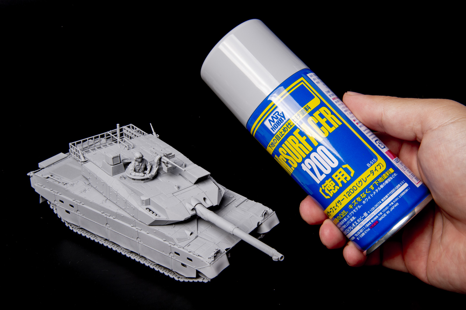 また、プラとは違う色で塗装したい!という時にも効果を発揮します。明るい色(白、黄色、赤など)の塗料は暗い色(緑、青、黒など)の下地が透けてしまい、うまく発色しません。こういう時は上塗りする塗料の明るさに近い、ホワイト等のサフを吹いてから上塗りをするとキレイに発色します。あと、細かい傷を埋めるとも言われますが、それは都市伝説です。