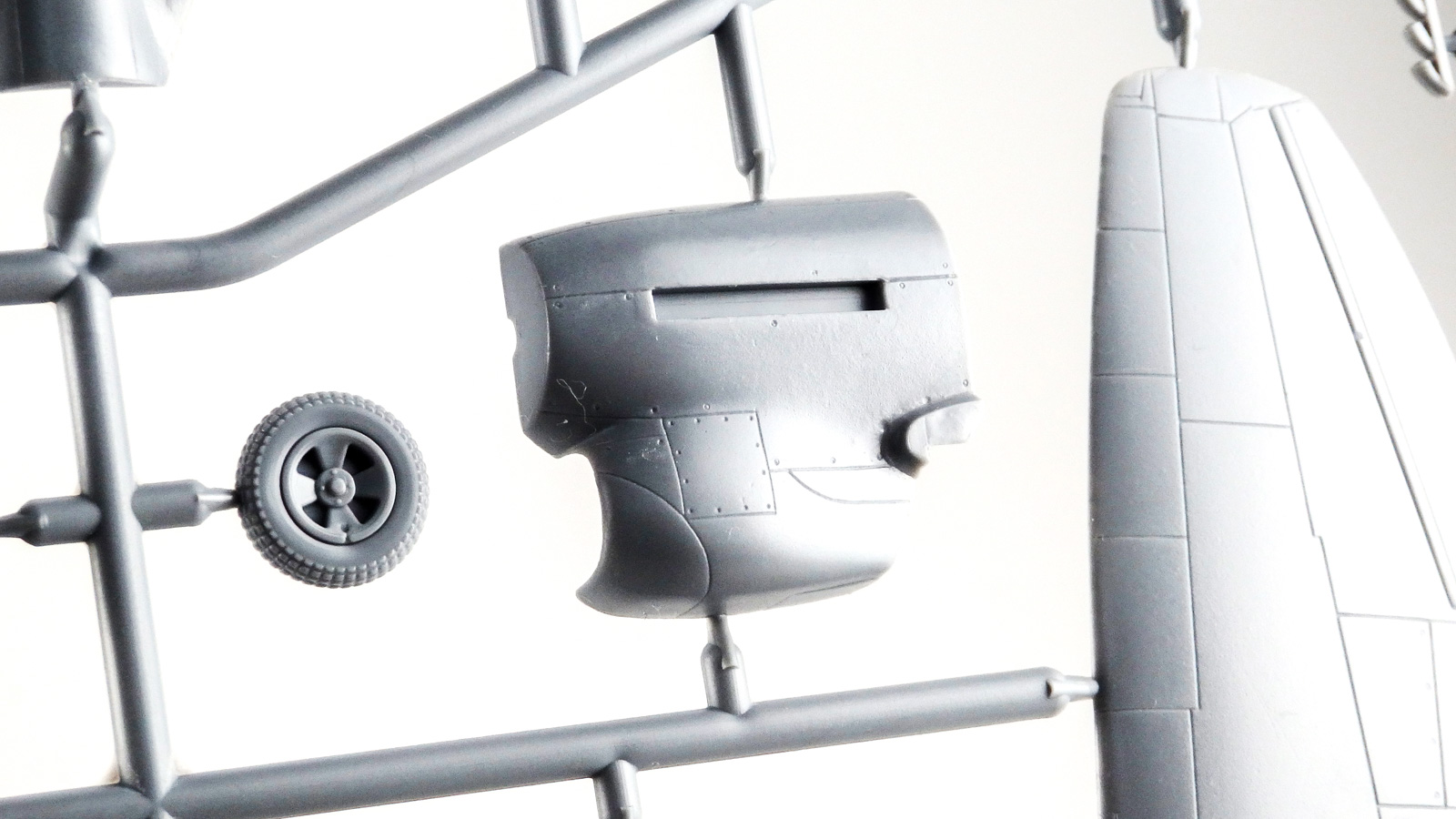 テンペストはエンジンを載せて替えたバリエーションもあるため、機首が別パーツになってたりしているのがランナー状態からも分かります。パネルラインの凹モールドも大変シャープで安心だね!注目なのはタイヤのディテール。ブロックパターンと呼ばれるトレッドパターンを上手く表現してあり、これだけでにこにこしながら一杯やれる感じ。1/72ならこれで十分じゃよ!