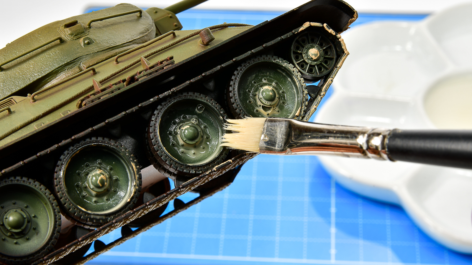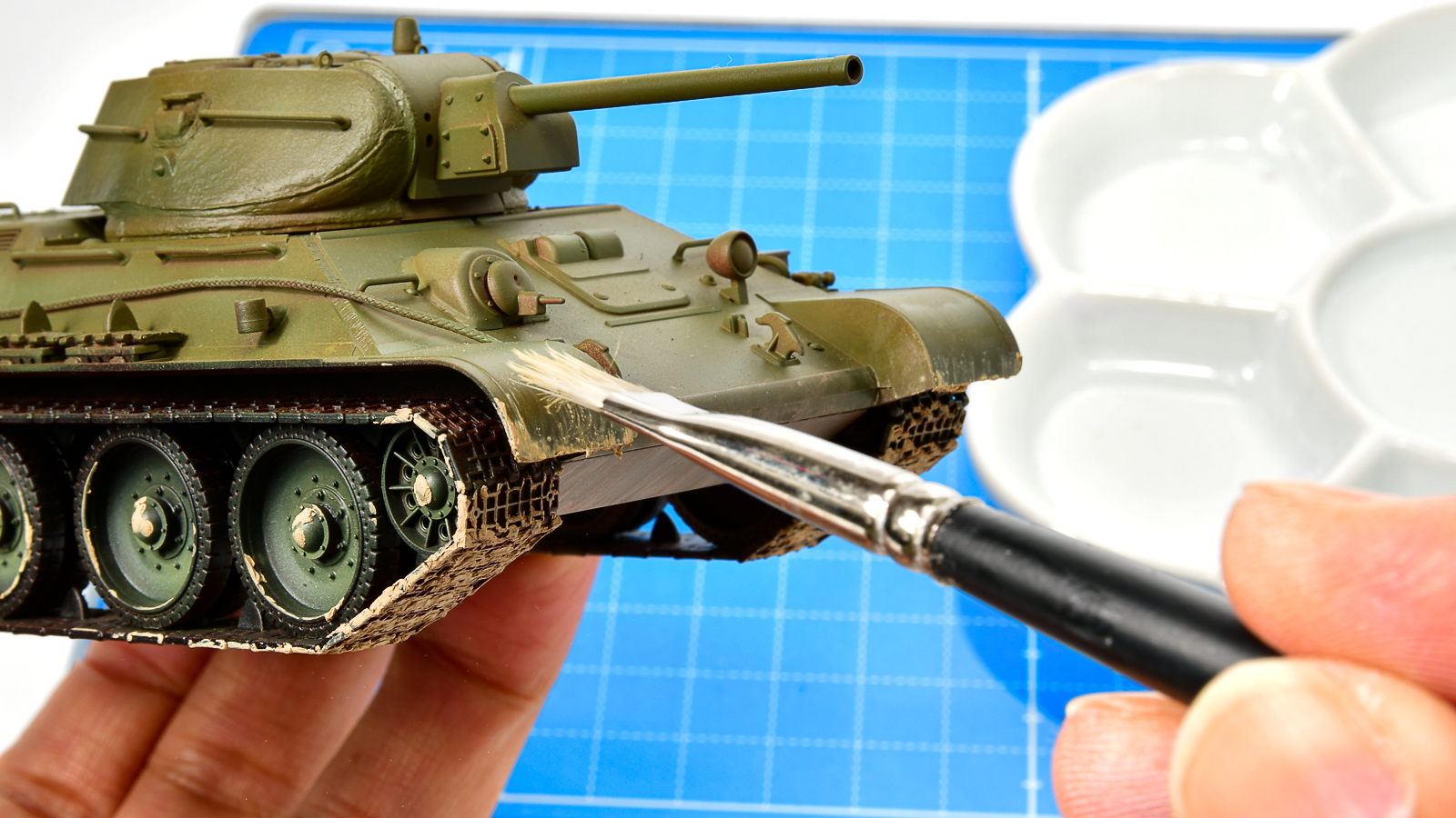 ウェザリングに迷っている人がいたらまずは使ってみてほしい「タミヤウェザリングスティック」。塗るだけで泥や土、雪など立体的な汚しができて、さらに「水」だけで希釈したり拭き取ったりできるので匂いもなく作業を楽しめます。