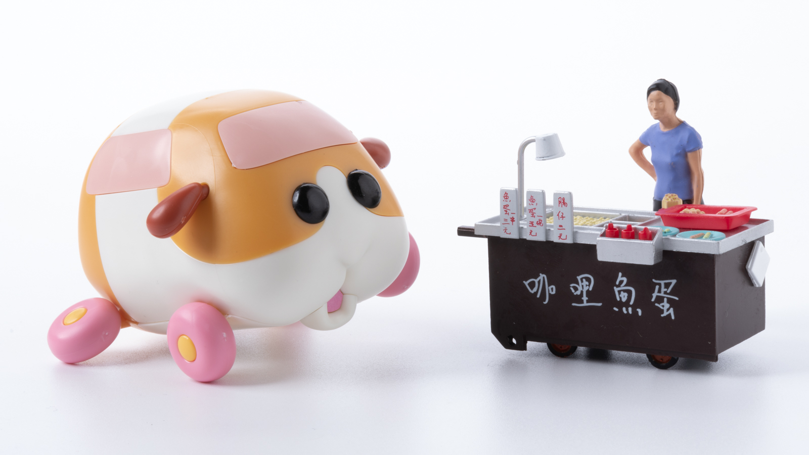 ポーズ用タイヤを使えばこんな姿勢で飾ることもできてしまうわけです。ちなみに右にある香港屋台のミニチュアはTINYという会社のもので、人間の大きさが先程のおねえさんとだいたい同じ(1/35スケールくらい)だったのでいっしょに並べてみました。ああっ!すでにいろんなシチュエーションで遊ぶ想像が止まらない……。