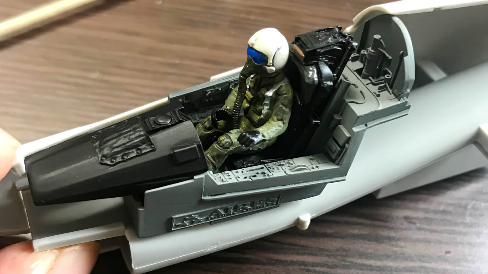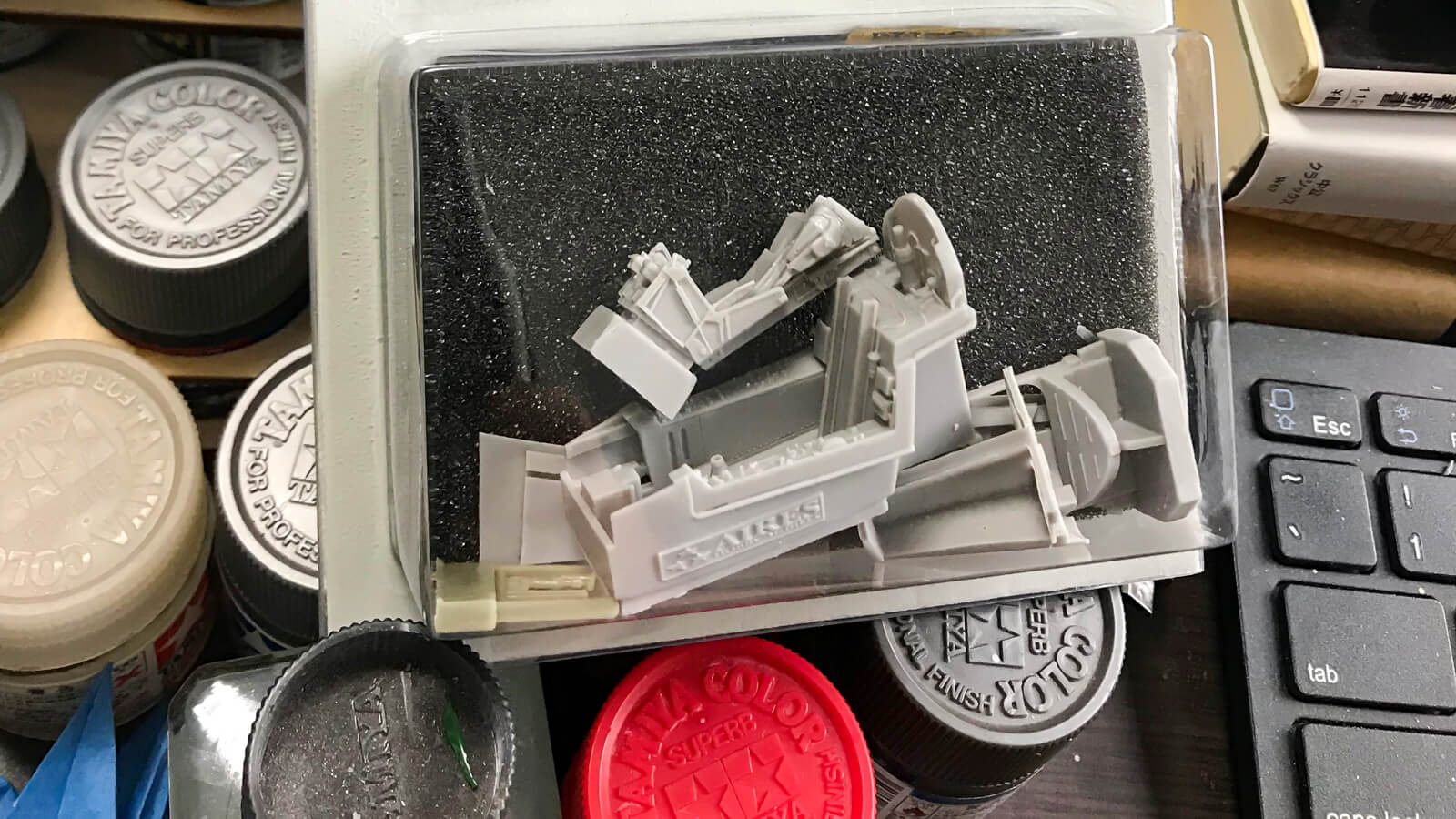 ネットによると、まずは脱脂の為にマジックリンに漬け込むとあるので、台所にあったマジックリンに1日漬け込んで、パーツをニッパーで切り出して不要パーツはガリガリ削り、ササっと組んでみます。するとキットのコクピットよりもずっと解像度の高いコクピットが出来上がります。パイロットなど乗せてみたりして「よくできてるなー」と愛でてみたり。
