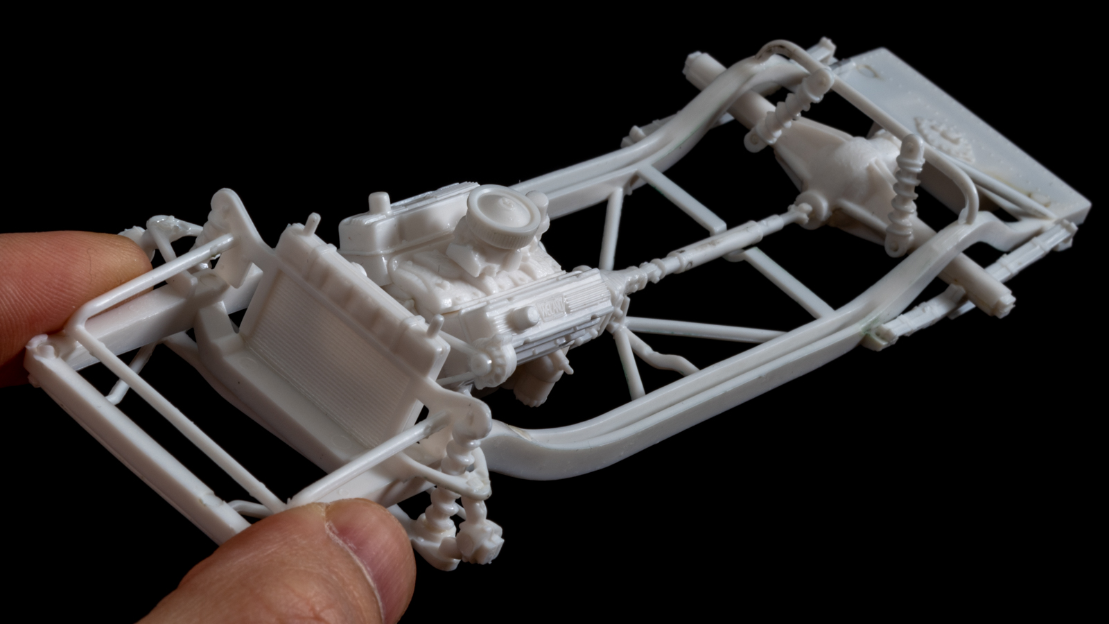 びっくりするようなカープラモだ。多くの人がクルマを認識するのに最も注目する「顔」がない。顔どころかAピラーより前がバッサリと切断されたボディー、ほぼ剥き出しのエンジンと前輪を支えるべく組まれたチューブラーフレーム、トレッドパターンの刻まれた幅広のオープンタイヤ。透明パーツはない。Rat Trap(ネズミ捕り)の名もむべなるかな。