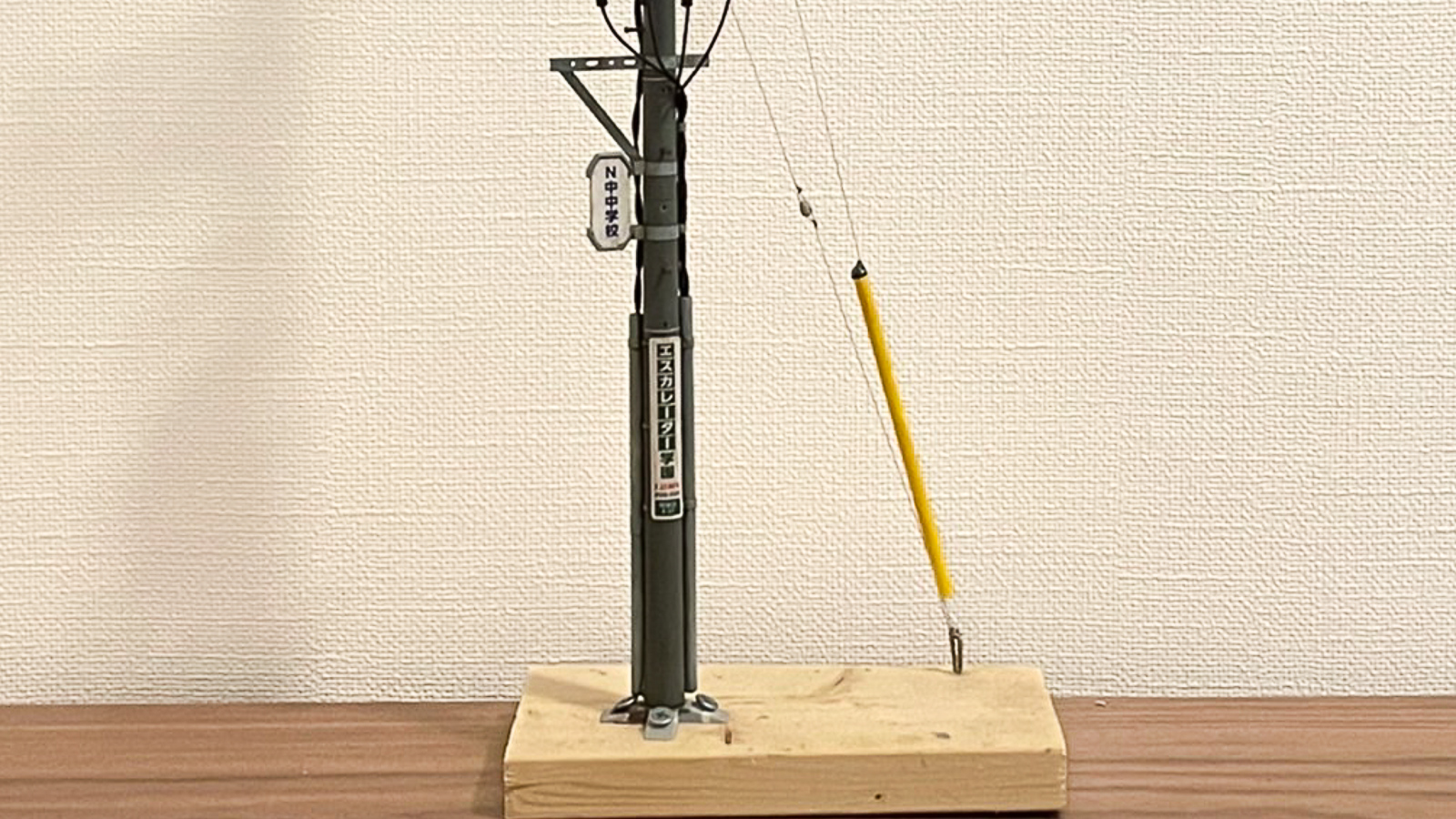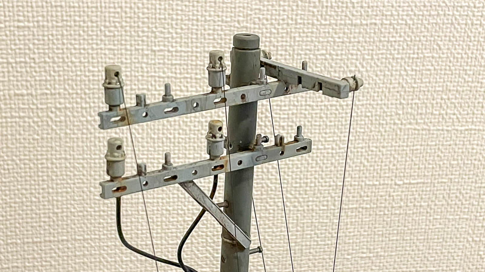 一方で、電柱って本当に一本づつくっついてる機材や電線の張り方が違うんで、ディテールがある程度適当でもなんか電柱っぽく見えるというところもある。自分が作ったものもリード線やらピアノ線やらで色々デコレーションしてますが、何本か家の近所の電柱を眺めて「ほ~ん、こんな感じか」と適当にくっつけただけ。多分仕事で電柱の保守管理とかやってる人から見たら「これはないわ」という出来だと思うんですが、パッと見はなんか「リアル~」という感じに見えるんで個人的にはもうオッケー。適当に細い線を足しただけで「あ~、見たことある!」となるのはかなりの快感です。