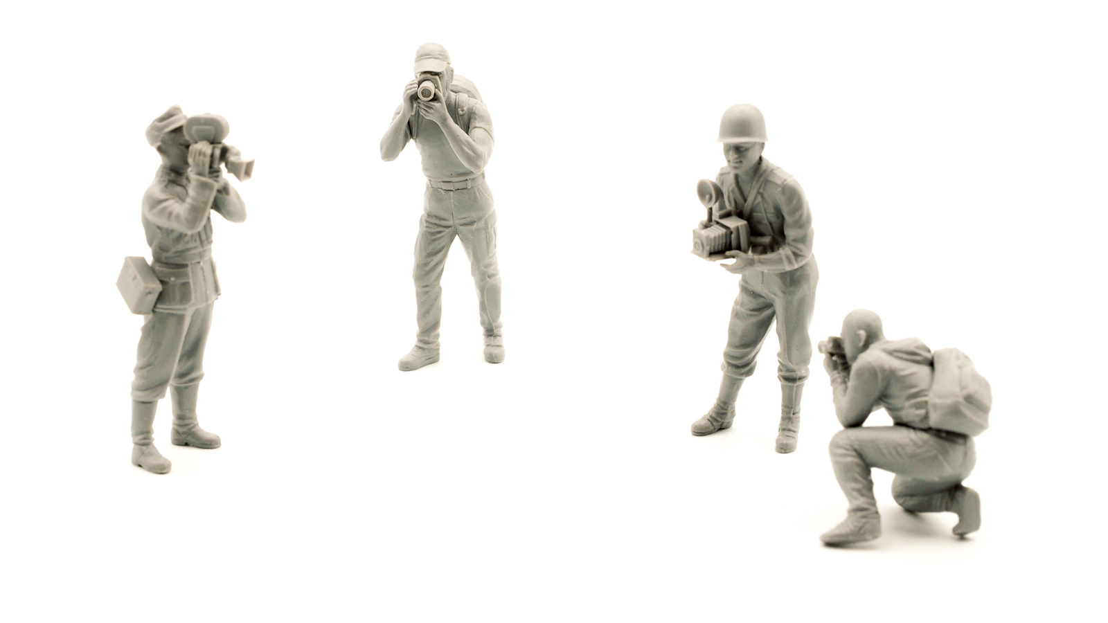 じっくり動かして満足いくとこで固定して、四人のカメラマンが完成。皆いいですね。大戦中のアメリカ軍、ドイツ軍、現代風のひげもじゃとスキンヘッド。時代や場所は違えども、カメラを通じてつながった四人です。ひげもじゃのバッテリーパックを付けた1眼レフっぽいのとスキンヘッドのミラーレスっぽいのと、二人それぞれのキャラ付けもよいです。