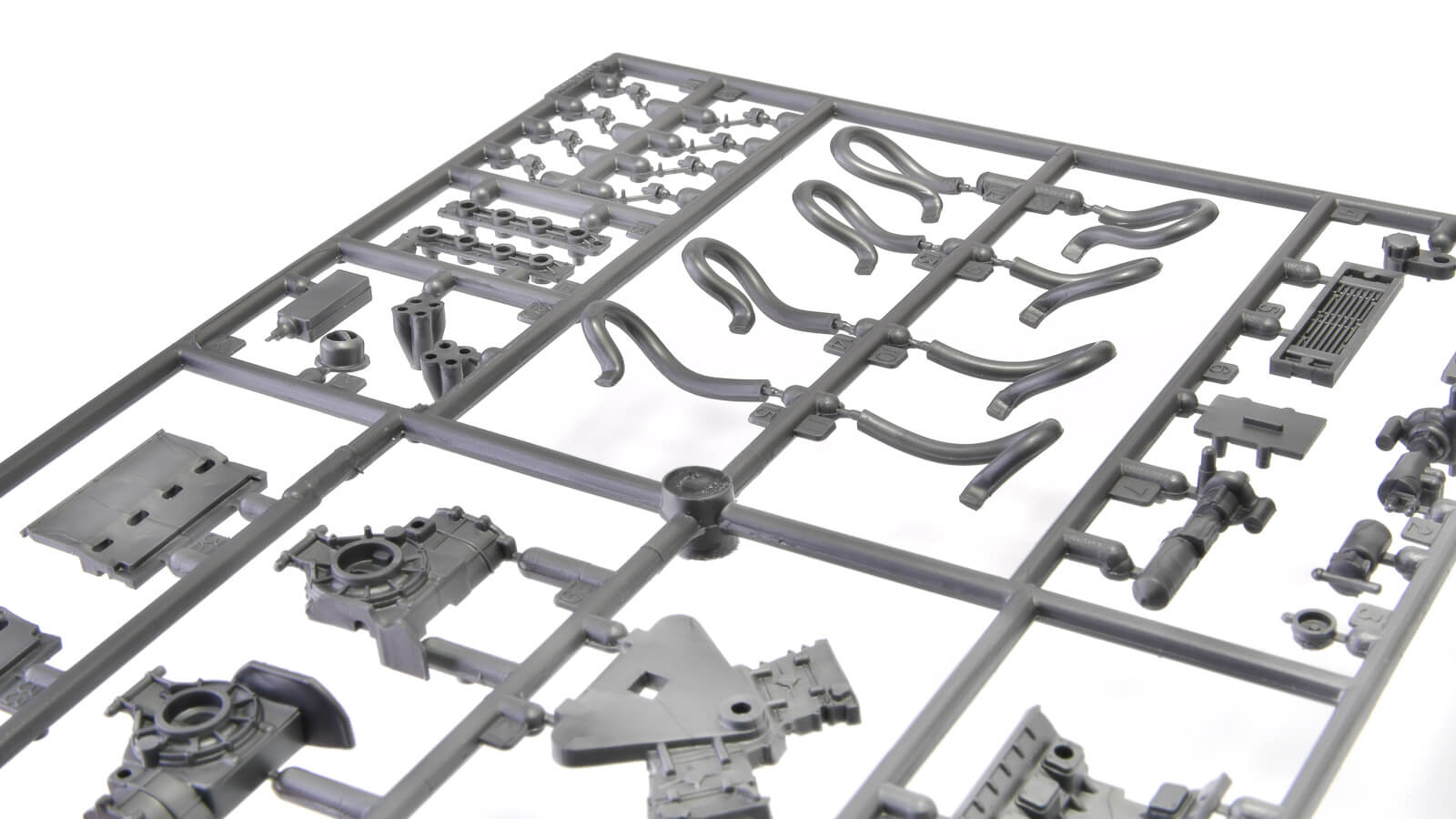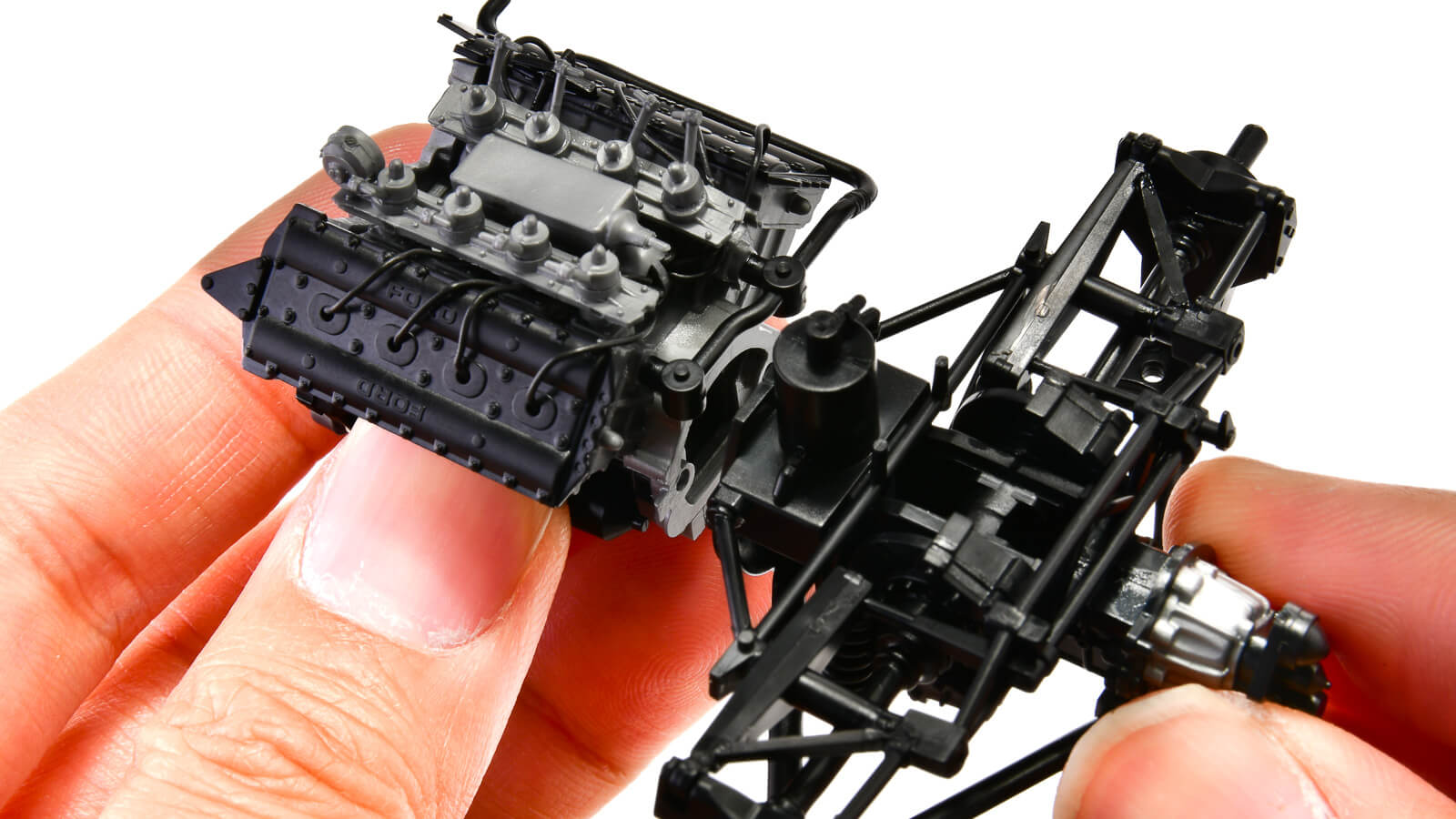 長きにわたりF1の心臓部を担ったDFVエンジンとヒューラントのギアボックス。このセットを買って、あとは車体を作ればF1に参戦できた、そんな時代があったんです。なんとタミヤは1/20 F1がはじまった当初のランナーをそのまま採用しました。