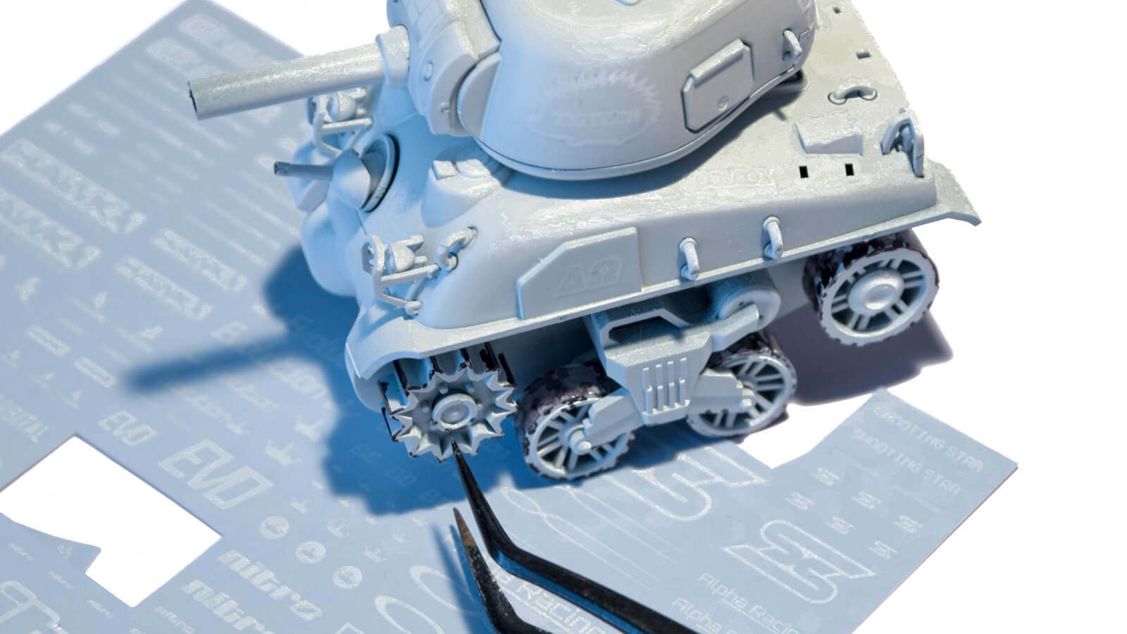ふと思いついて白いサフェーサーを吹きました。ミリタリーっぽさが薄くなり、デフォルメされた機械のフォルムだけが見えてきました。さらにハイキューパーツ製の白いデカールをピタピタと貼って、どこの何時代のものかよくわからない感じにしていきます。