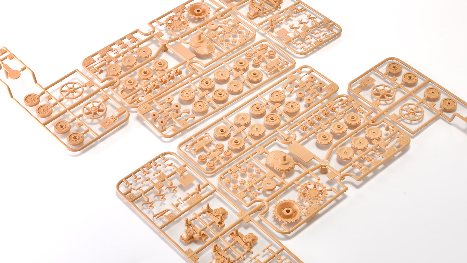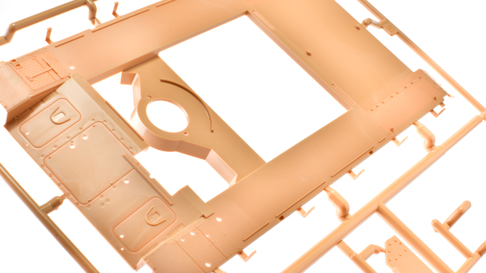 誰が見ても「でかい箱じゃん!」って思ってしまうほどのインパクト。この箱型の固定戦闘室が最大の特徴ですね。前面100mm、側面50mmととってもマッチョ!! タミヤもこのパーツを、前面&側面を1パーツにしたマッチョなパーツで送り出し、パーツを見ただけで「ブルムベアの戦闘室の迫力」を味わえる構成としています。