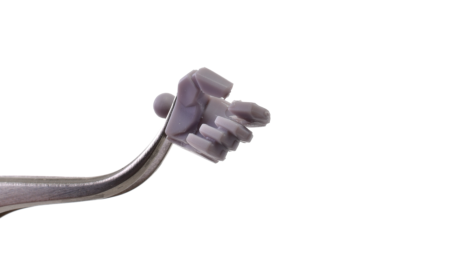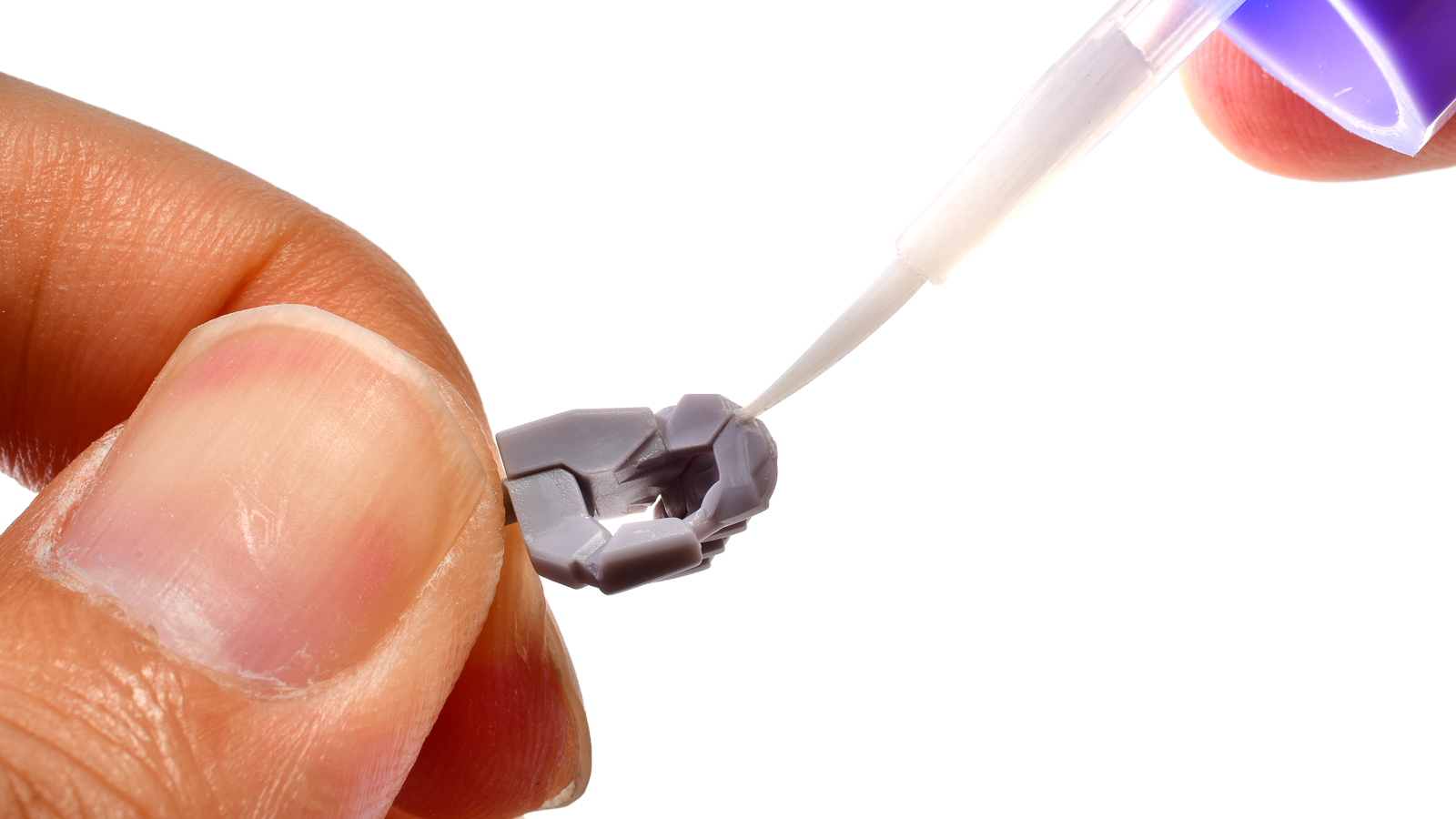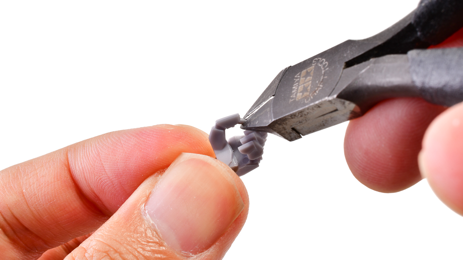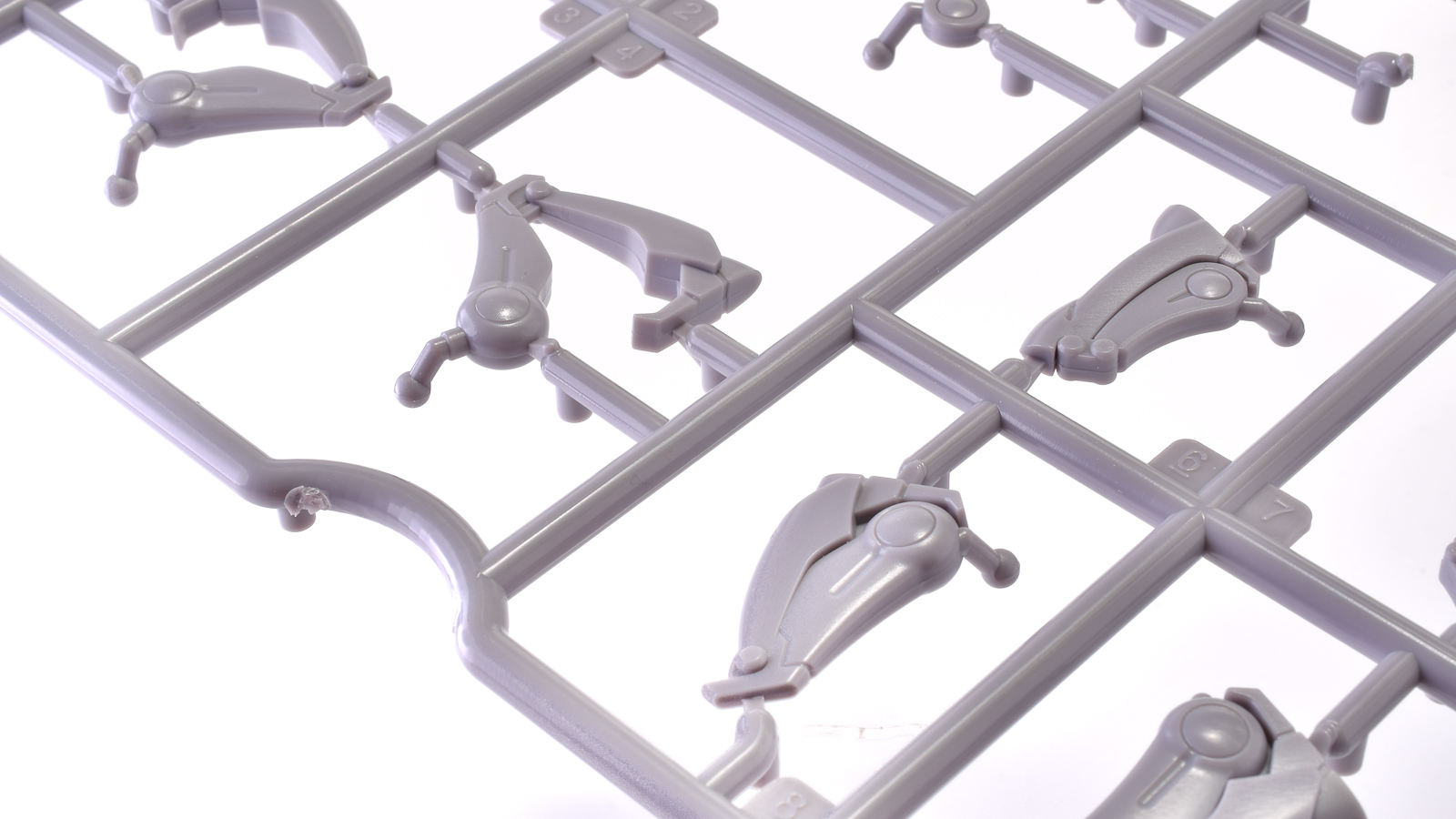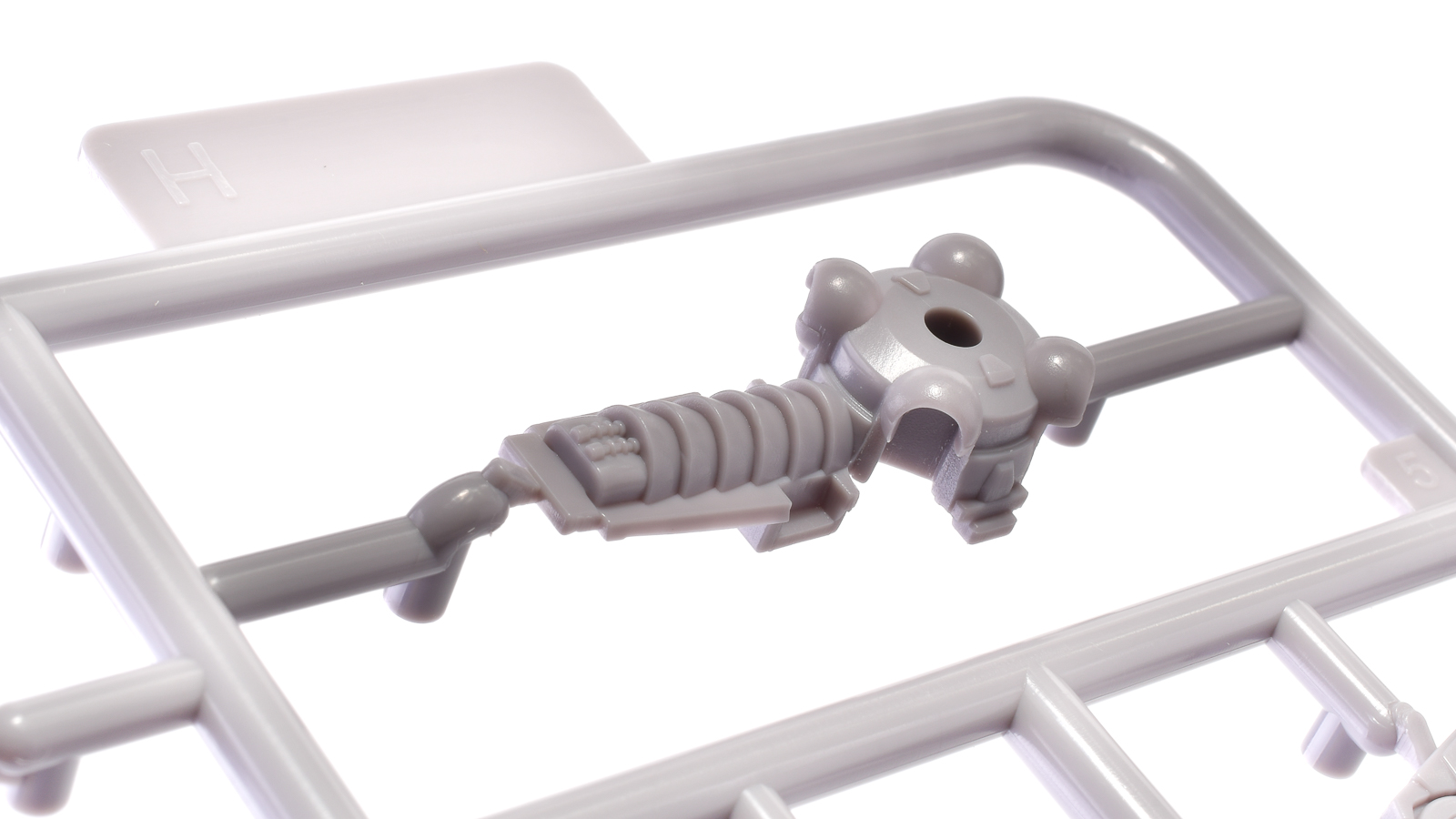 エステバリス 陸戦フレームの手首。こちらかっこいい形状の指を、なるべく少ないパーツ数と取り回しやすいサイズで表現するために、上のように一部の指と指の間にちょっとした棒をつけて一緒に成型されています。気にならなければこのままで良いですが、この棒を組んだ後に切り飛ばすだけで、さらにかっこいい手首になります。
