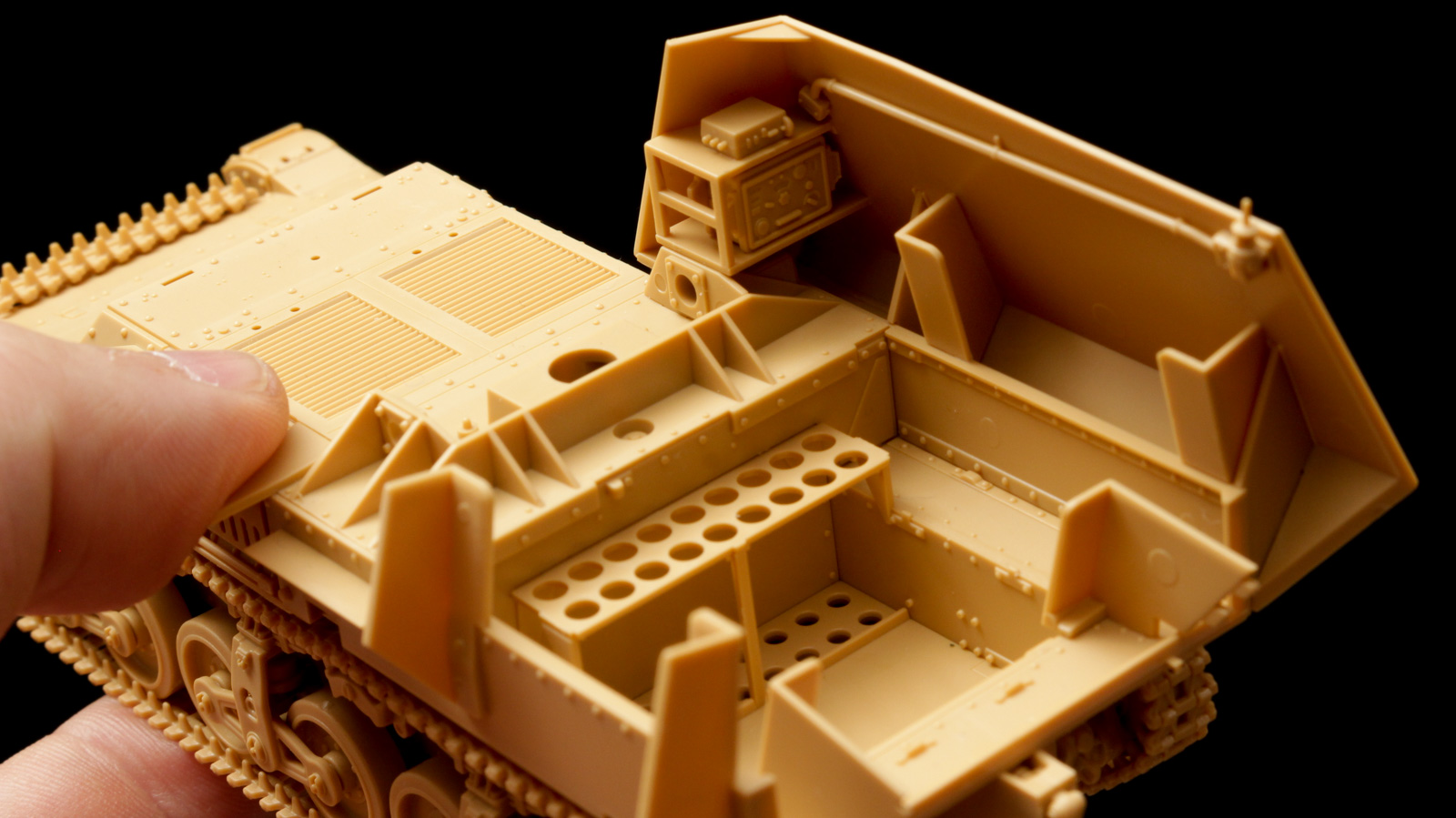 本当に感心したのはここ。必ずしも戦闘室を装甲で囲わなくても形になるのだ。そのおかげで見え方を調整できる。僕は装甲をボンドで仮止めして、どれくらい囲えば中の様子が程よく見えるのかを確かめた。右側の装甲の棚には無線機が置いてあるので、覗き込んだときに精密感がある。反面、兵士のうち一人は左側の装甲に腕を置いている。とはいうもののすべてを覆わないほうが日差しが入ったときの美しさは損なわれない。何度か試して、結局右側の装甲だけを取り付けた。