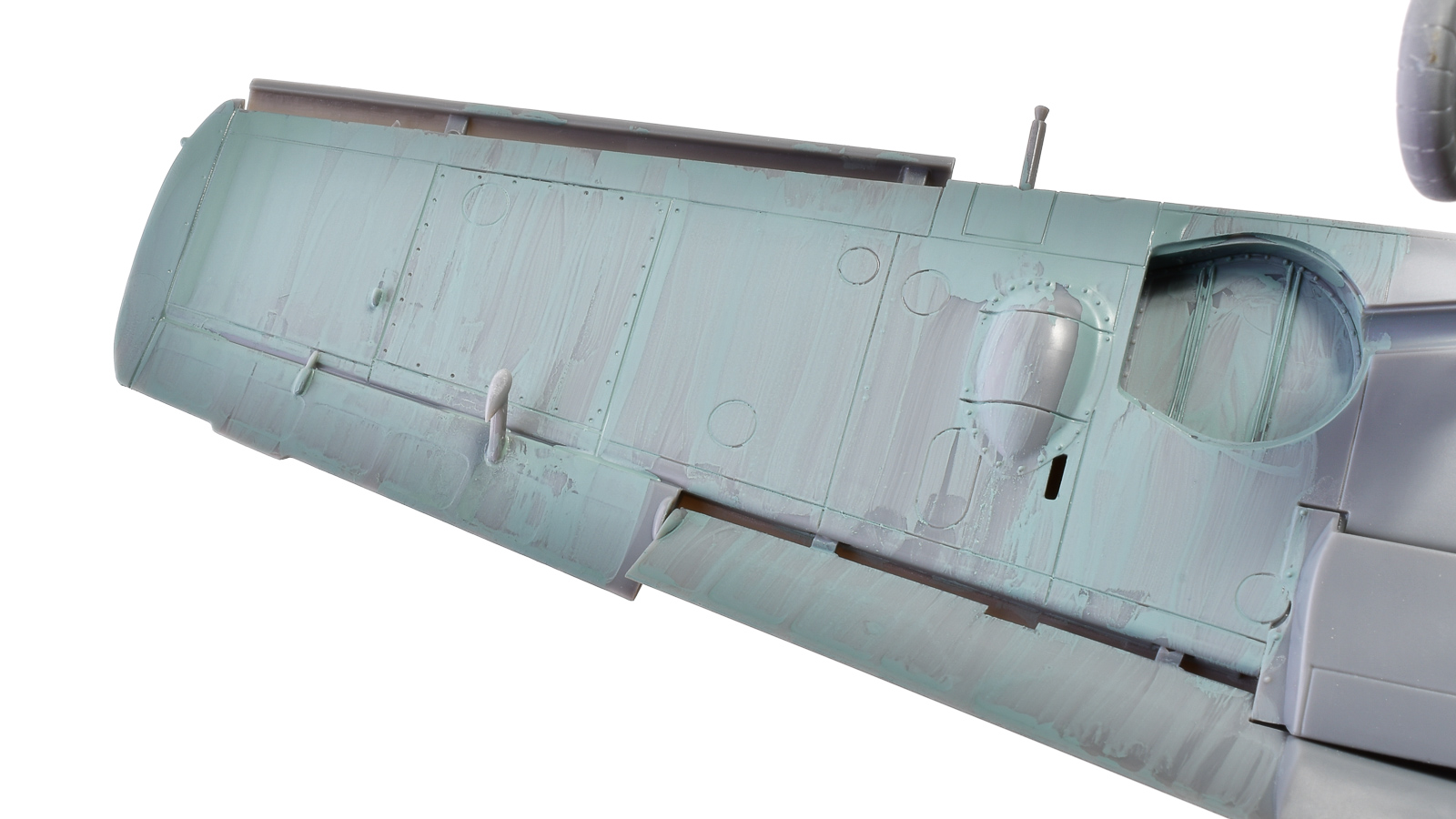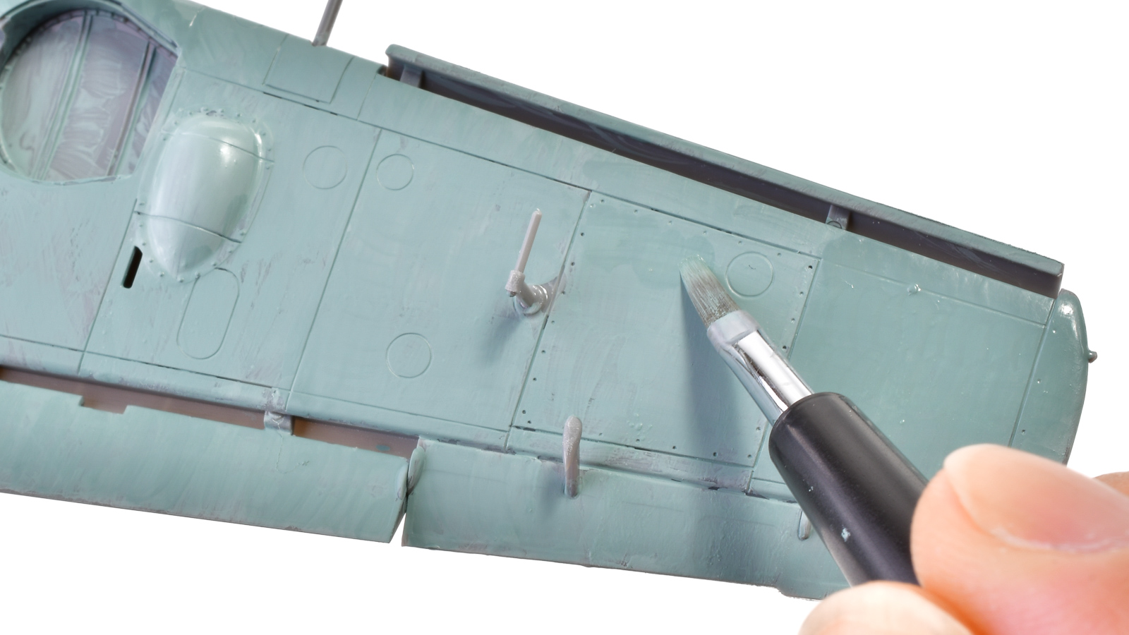 ここからが丸平筆の面白さ。筆のタッチと言いましたが、先が丸くなっていることを活かして「筆先でポンポンとスタンプするように塗る」と筆先に塗った塗料だけをパーツに押し付けることができます。それを活かしてグラデーションや、パーツ表面が褪色したような表現など、味付けができるのです。これが本当に楽しいです。
