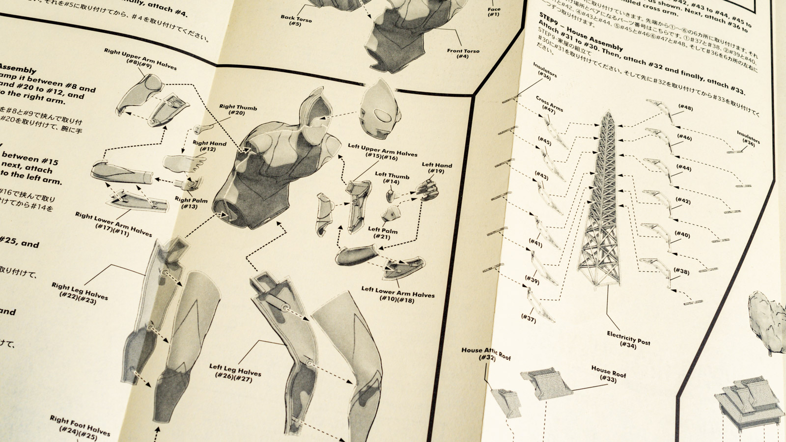 キットのパーツをいちどに全部紹介するのもイキじゃないので、今回はここまで。はやく貼りたくてウズウズするプラモというのは、やっぱり演出がうまい。みなさんもすげーよくできた高圧線鉄塔(と、ウルトラマン!)のプラモデルを買って「知ってた?」といろんな人に教えてあげましょう。きっと「なにそれ、おもしろそう!」と食いついてくれるはずです。そんじゃまた。
