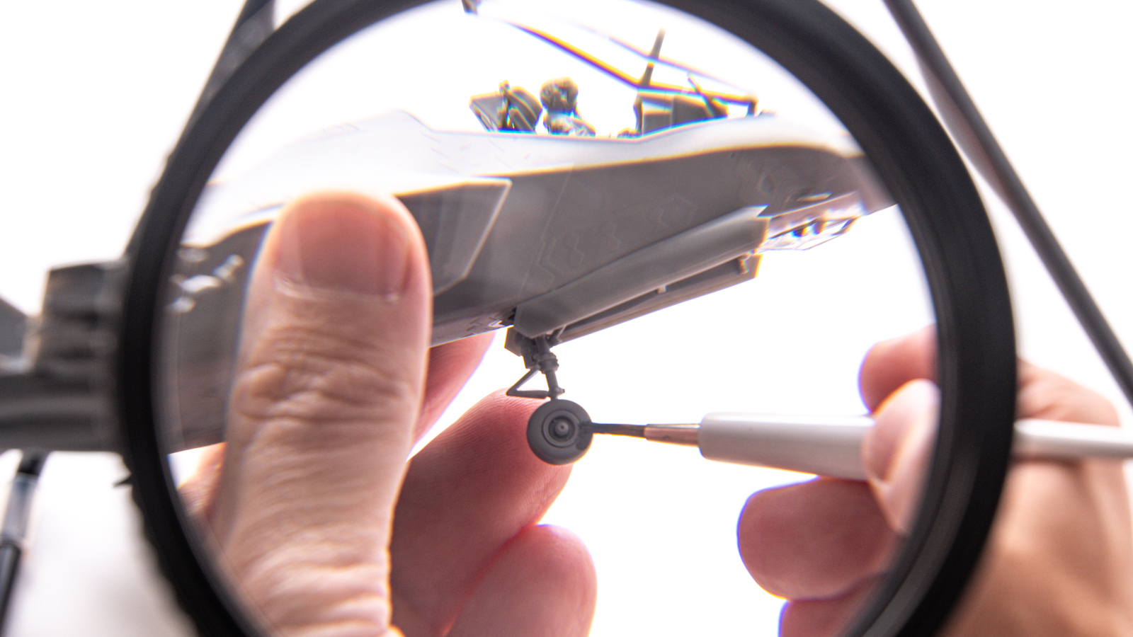 模型作るときに大事なのは明るさと「対象物がちゃんと見えている」ということ。いまいち見えづらいなぁ……と思っているときは、いまいち削れていないしいまいち塗れていないと思ったほうがいいです。机の上を充分に明るく照らし、パーツが大きく見える状態で工作や塗装をすれば、ちょっとばかりラフに見えても肉眼ではだいぶキリッとした仕上がりになります。拡大鏡は「モノを拡大して普通よりも緻密な仕事をする」というよりも「あ、これくらいできていると精密な感じに見えるんだな」という感覚を体得するためにあると私は思っています。