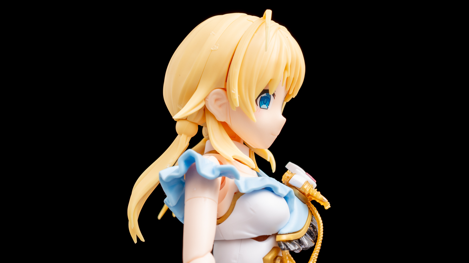 八宮めぐるは日本人の父とアメリカ人の母を持つらしく、快活な性格は表情にも現れているし、二つ結びの金髪を自在に動かせるよう左右それぞれに3軸の関節を仕込んでいる。それよりも驚いたのはまとめきらなかった髪が耳の後ろから肩の前側に流れる様子を再現したパーツだ。
