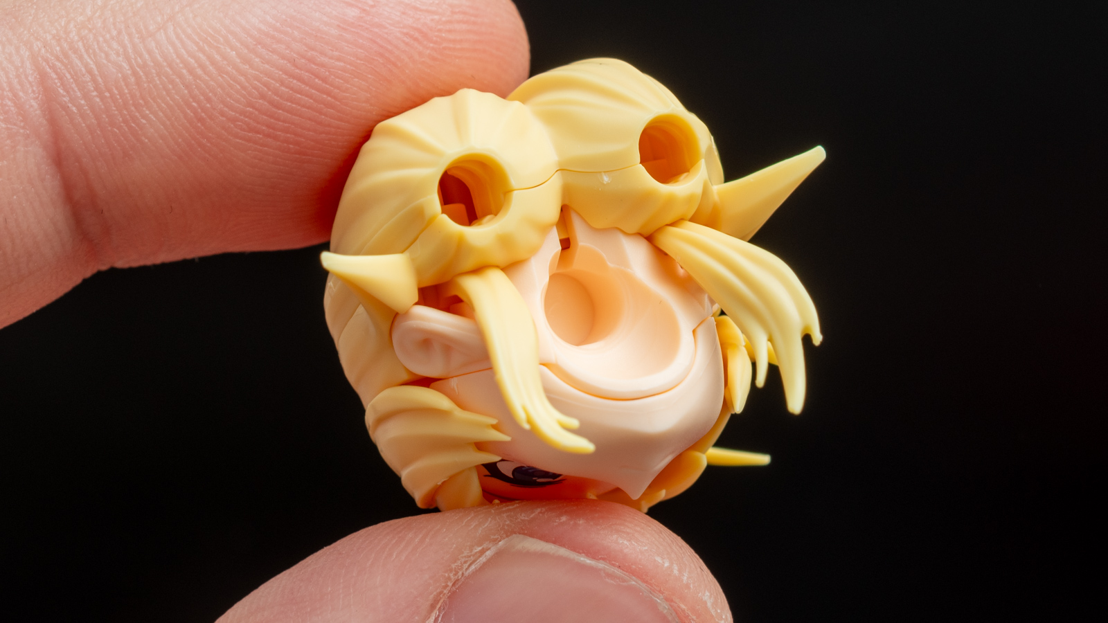 そのなかでも本当に素晴らしいと思ったのが頭部の中核をなす「FS-B5 8」のパーツだ。顔面のパーツと髪の毛のパーツ、そして首のユニットを受け止めるという意味ではロボットモデルの内部フレームのような機能を果たしているが、左右に突き出た耳の造形は出色の出来。『アイドルマスター シャイニーカラーズ』のイラストに見られるアニメ調の整理された線で描かれた耳よりもかなり写実的で、フィギュアに実在感を与えている。