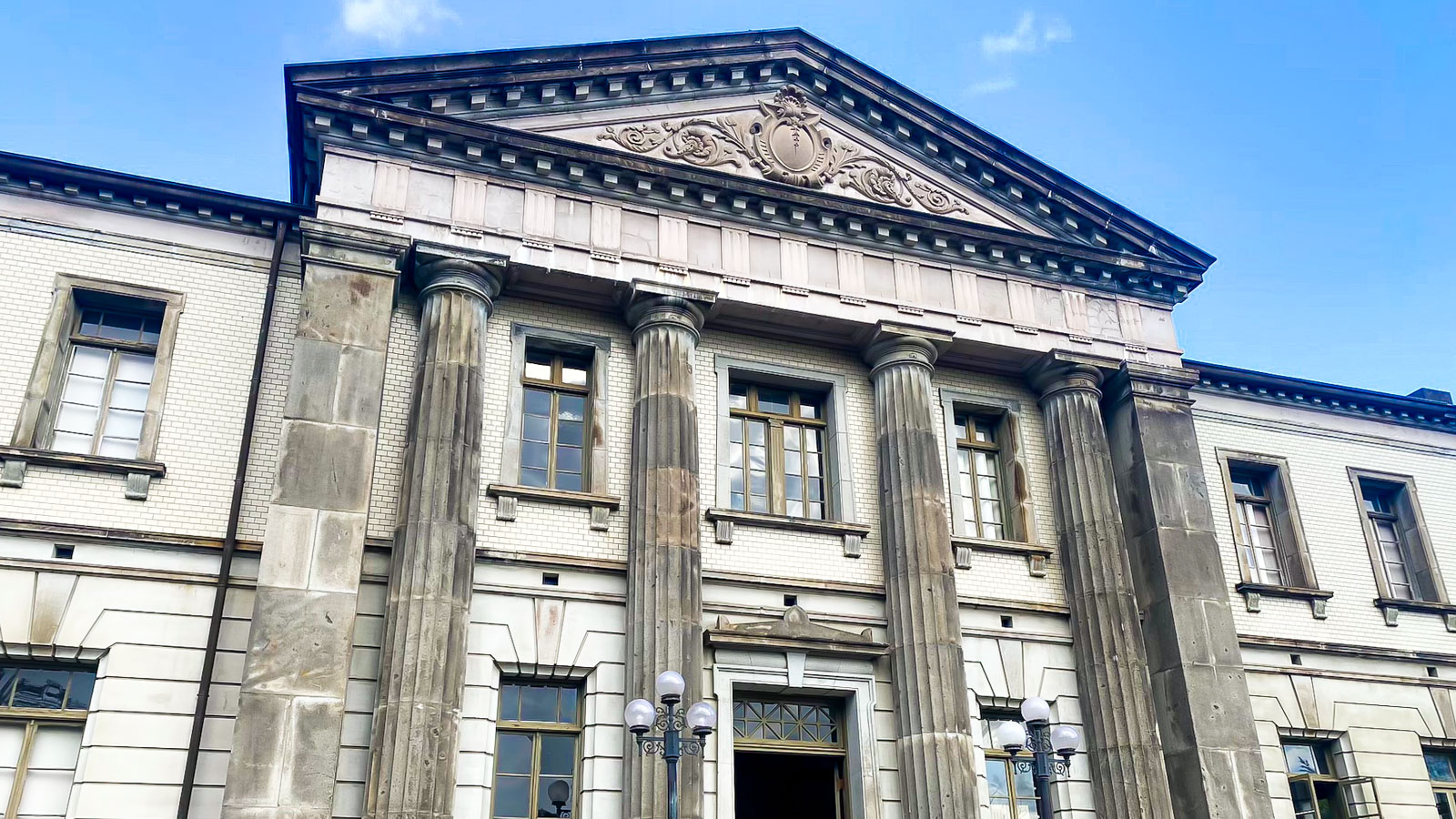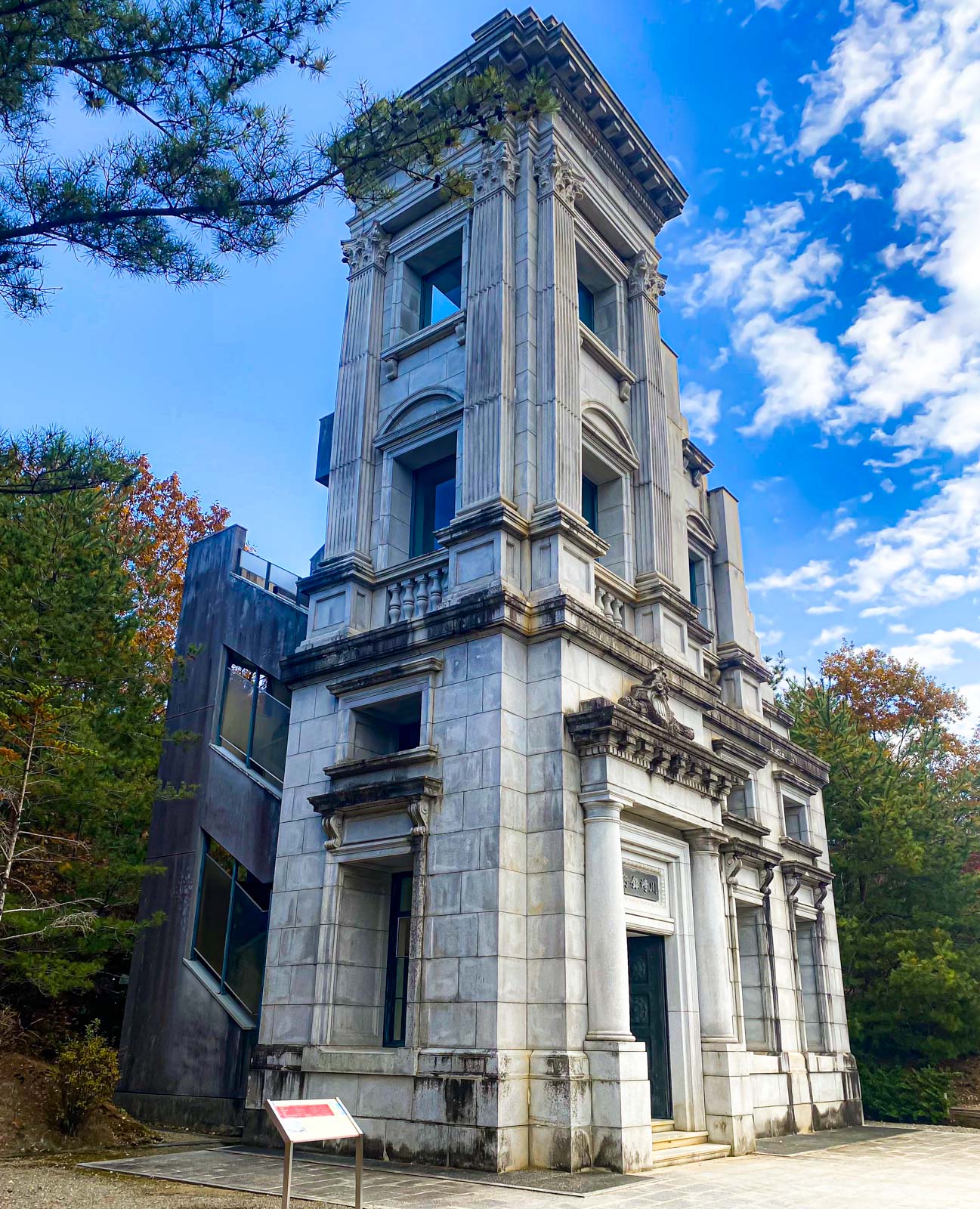 川崎銀行本店の向かって左側の一部の上から見た景色。屋外博物館で味わえるのは時間はおろか真贋も空間も超えた臨死体験です。
