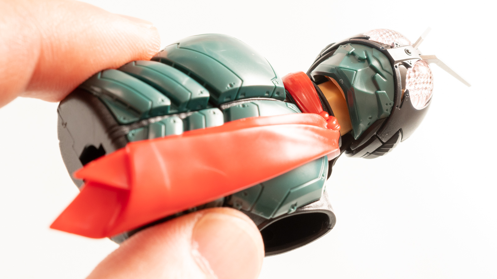 バンダイスピリッツの売り文句どおり、とにかくパーツのツヤのコントロールがスゴい。ゴワゴワの革とツルツルの外装のコントラスト、素晴らしいです。しかし一箇所だけ何だこりゃと思ったところがあるんですよ。それは頭部の肌色のパーツ。首は確かに完成後も肌が見えるけど、顔面にも肌色があるんですよね。それはなぜかというと……?