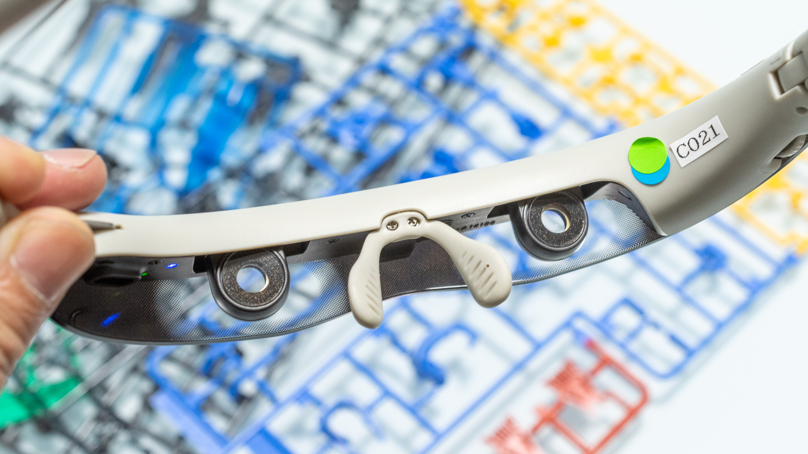 メガネのようでメガネでない、なんとも不思議な見た目の機械(オートフォーカスアイウェア)。眉間に仕込まれたセンサーが対象物の距離を測り、両目のレンズを通して見ている場所に爆速でフォーカスを合わせてくれます。メガネと違うのは、機械が人間の機能を能動的にアシストするという点。みんなが大好きなパワードスーツが運動機能を強化してくれるように、このデバイスは視覚という身体機能を拡張してくれるというワケです。