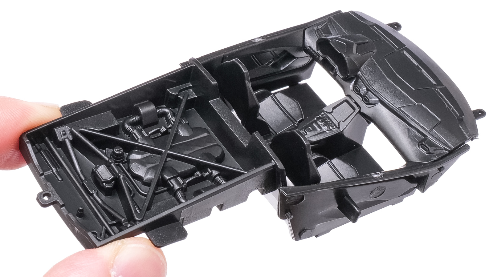 このプラモデルのいちばんの見どころはキャビンと一体になったエンジンルームのパーツです。ドアの内張りとダッシュボードがフロアやシートとワンパーツになっていて、折り曲げることでバスタブのようなキャビンが組み上がる設計はアオシマの「ザ・スナップ キット」シリーズに共通するものですが、ミッドシップ縦置きのV12エンジンが(上面だけとは言え)再現されている特異なカタチになっています。