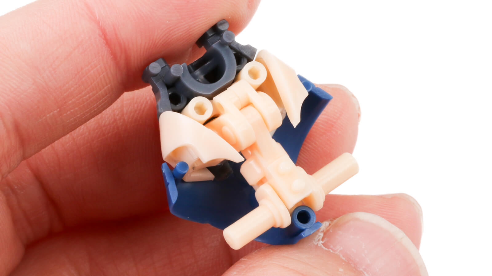 パーツ分割の妙は頭髪にもあります。インナーカラーの青いパーツを配して、ふさ多めの赤いパーツを重ねていくところ、パーツ数もベリショなのにリッチでパズル的。先端が鋭く手にチクチクと感じるシャープなディテールもまたボークスらしい。面白いところです。