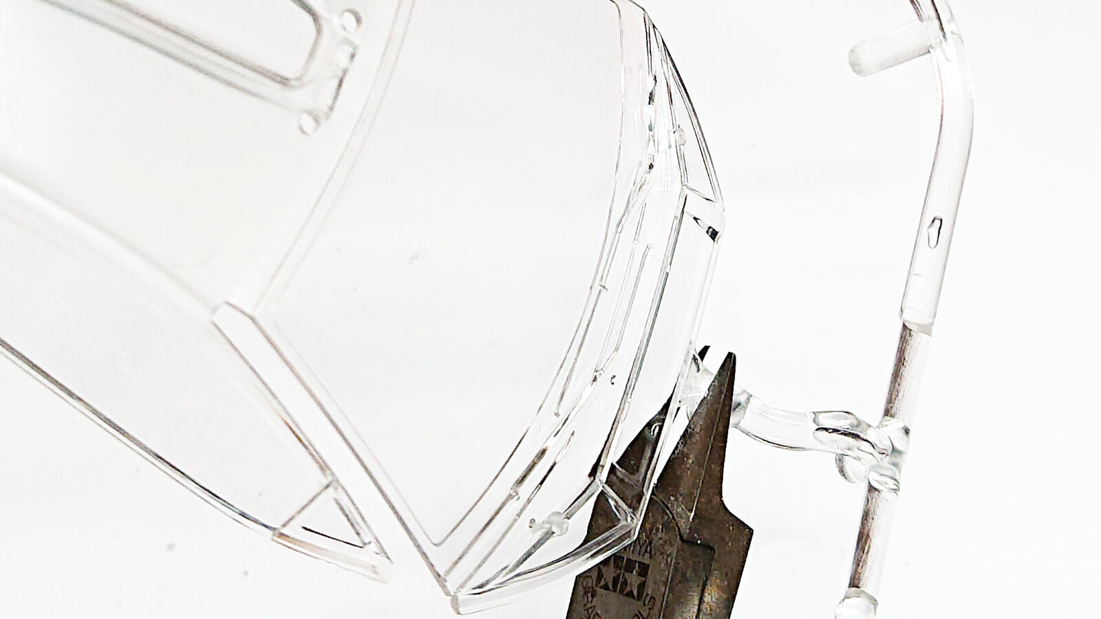 缶スプレーで塗り分けるためにはウィンドウのマスキングが必要です。楽プラシリーズならタミヤのマスキングテープとカッターナイフ、台所の爪楊枝があれば十分です。表側の窓枠はモールドがはっきりしています。そこでテープを貼った後に爪楊枝を使って馴染ませ、浮かび上がった境界に沿ってカッターナイフで切り取ればOKです。
