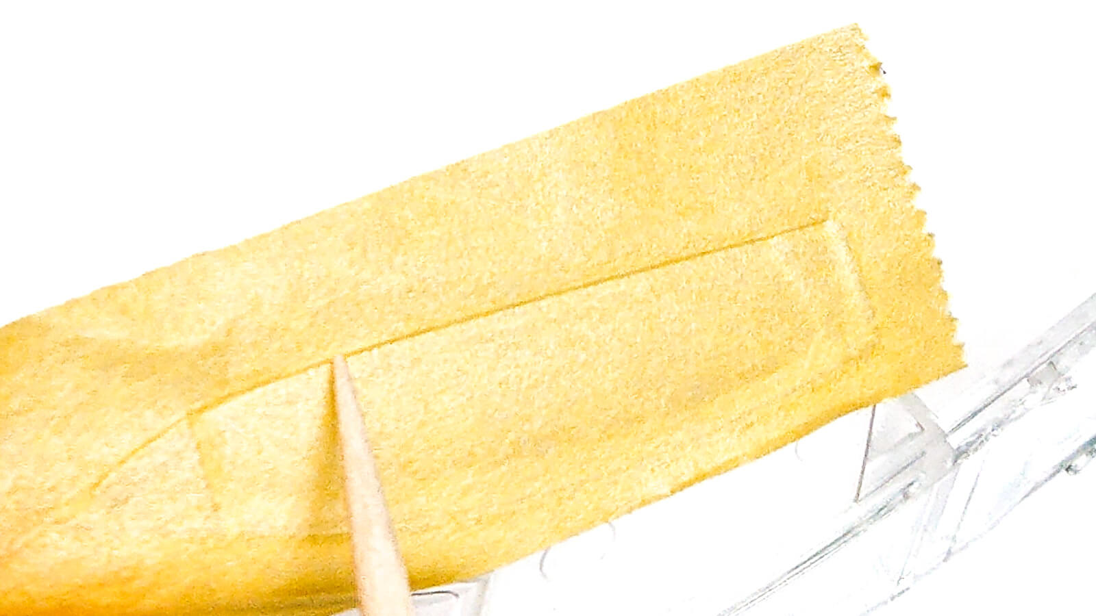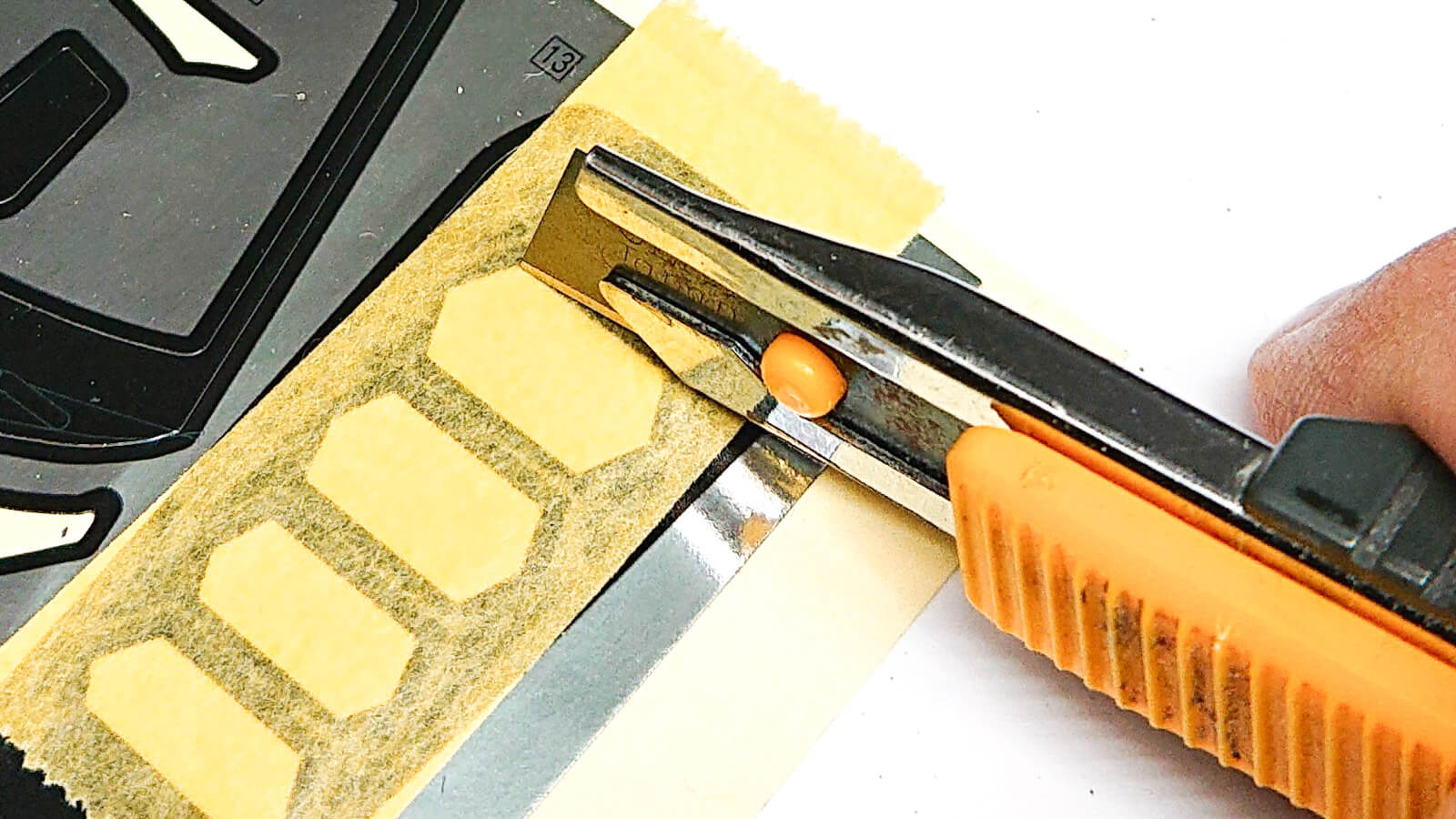 裏側はキットのシールを活用してマスキングテープを切り出します。写真のようにシールの一部をはがし、ここにマスキングテープを貼り付けて押さえつけますます。そして浮かび上がった段差に沿ってカッターナイフで切りこみを入れることで、ぴったりなサイズに切り出すことができます。