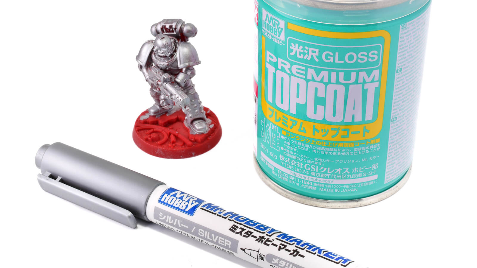 ミスターホビーマーカーは「水性塗料」です。ということで、ど直球「水性プレミアムトップコート 光沢」でコートしてみます。同じ水性塗料でも、本当に相性が良いのかは使ってみないとわかりません! いざ実験!!