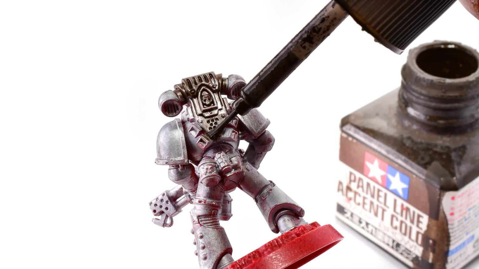 スミ入れやウォッシングなどが終わった後に、さらにこの上から一筆足して気軽に輝度調整ができるのもマーカー塗料の良いところ。下の銀はすでにコートされているので、上からマーカーを塗り重ねても溶けたりめくれたりすることもないです。