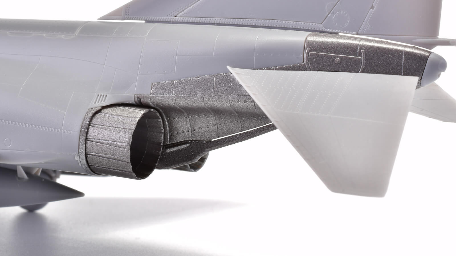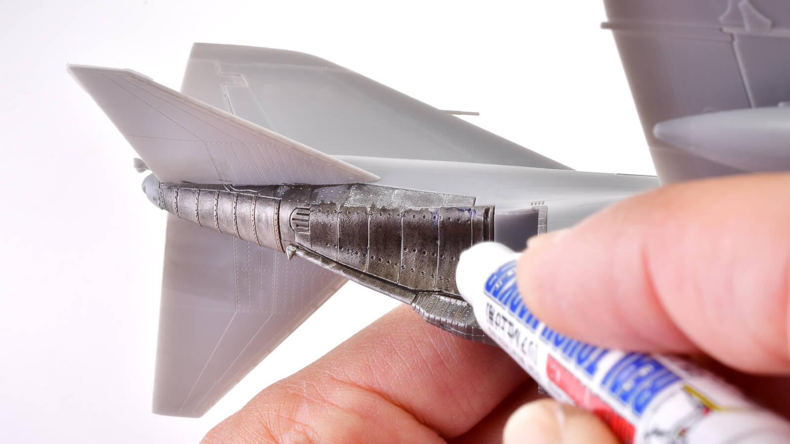 こちらジェット戦闘機「F-4 ファントム」のお尻部分。実機はシルバーの金属肌に、焼けや汚れが入りまくってすごくかっこ良くなっている部分です。