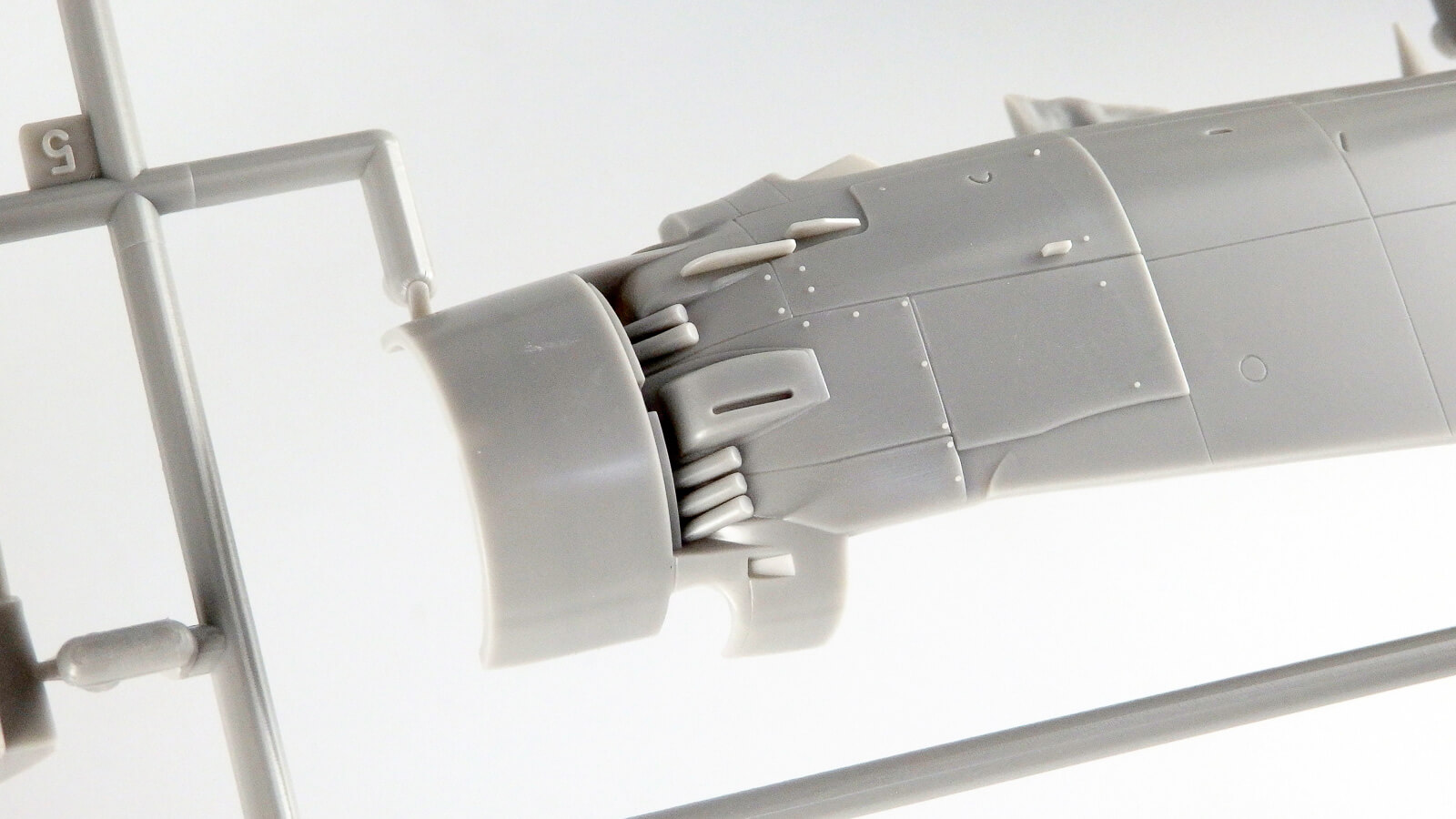 前よりのコクピットと、ズドンと太いままの尾翼までのラインが個性的。組み立てはオーソドックスなヒコーキプラモなので、士の字(胴体と翼ができて、ほぼ飛行機の形になった状態。漢字の「士」に似ていることからそう呼ばれています)にするのには1時間もかかんないです。むしろ15か所に及ぶ翼下面のパイロン(ウェポンラック)が最大の山場とも言えそうなキット。