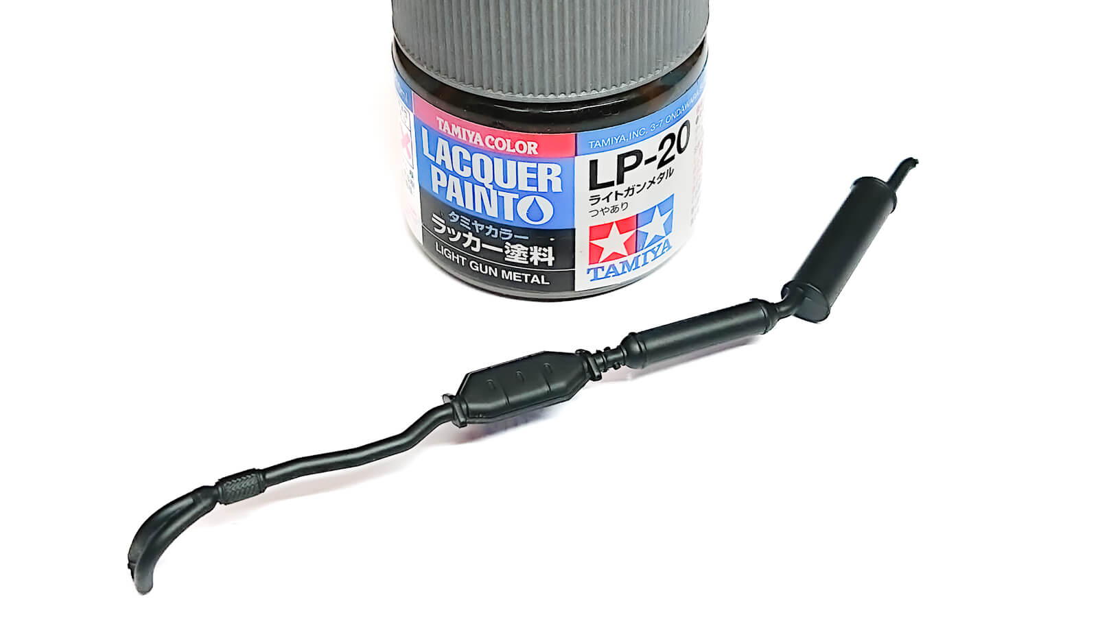 早速パーツに筆塗りしてみます。今回は熱が加わる金属の代表例である車の排気系を塗っていきます。ライトガンメタルの質感は排気系にピッタリです。筆塗りで使う際には瓶の中を均一に混ぜるのではなく、あえて瓶の底に沈んだメタリック粒子を多くとりましょう。こうすると一発で輝いてくれます。