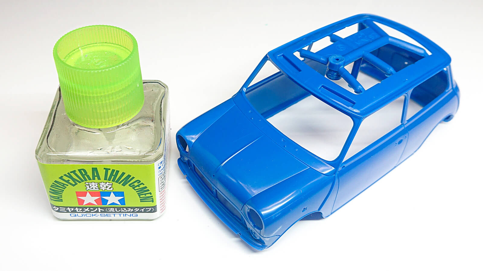 小柄なボディは鮮やかな青色で成型されていてツヤも十分です。パーティングラインもほとんど目立たないため塗らなくても涼しげなブルーのミニを楽しめます。