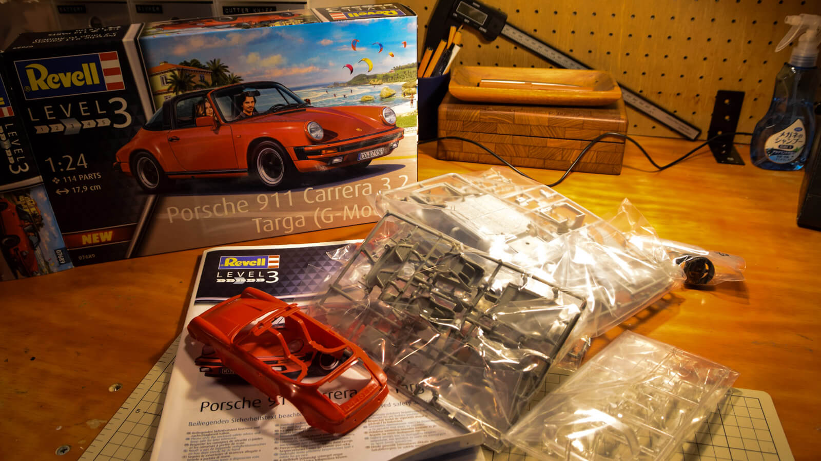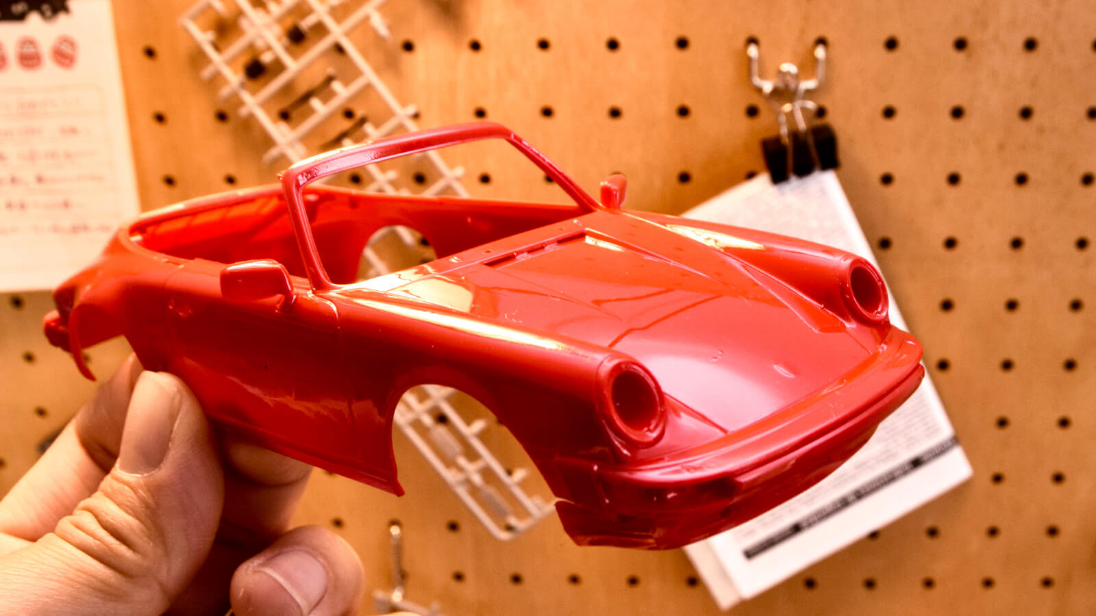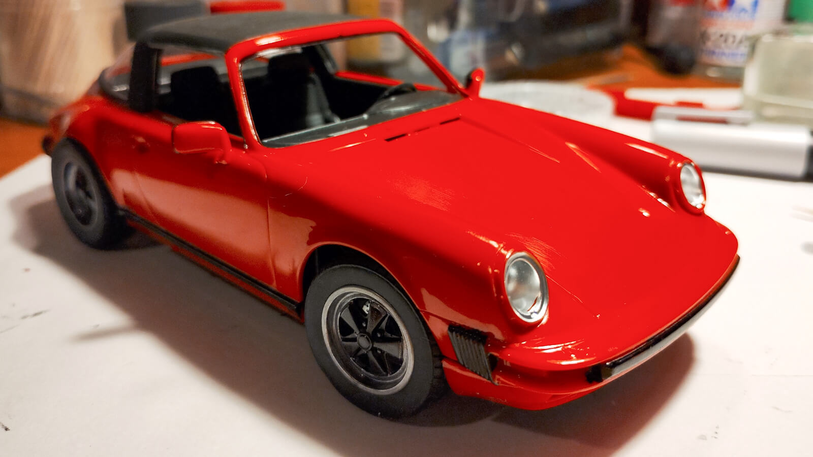 キットはこちら。レベルの1/24ポルシェ911タルガトップです。バリバリバリ。袋を開けるとグレーのランナーと真っ赤なボディが出てきます。そして、この赤いボディをそのままクリアコートします。しました。プレコーで。私が。