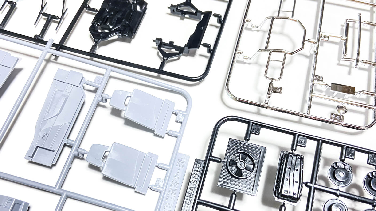 ランナーは黒、グレー、メッキパーツのほかに白やクリアパーツが入っています。右下に写っている黒色の扇風機がくっ付いているような部品はラジエター(エンジンの冷却液を冷やす装置)なのですが、大抵の車はラジエターがボディ内部にあるので、プラモデルでも省略されていることが多いです。ところがこのP35Wデリカは車の底面からラジエターが見える構造になっているのでこのように部品が成形されているのです。このパーツで初めてP35Wのラジエター事情を知りました。