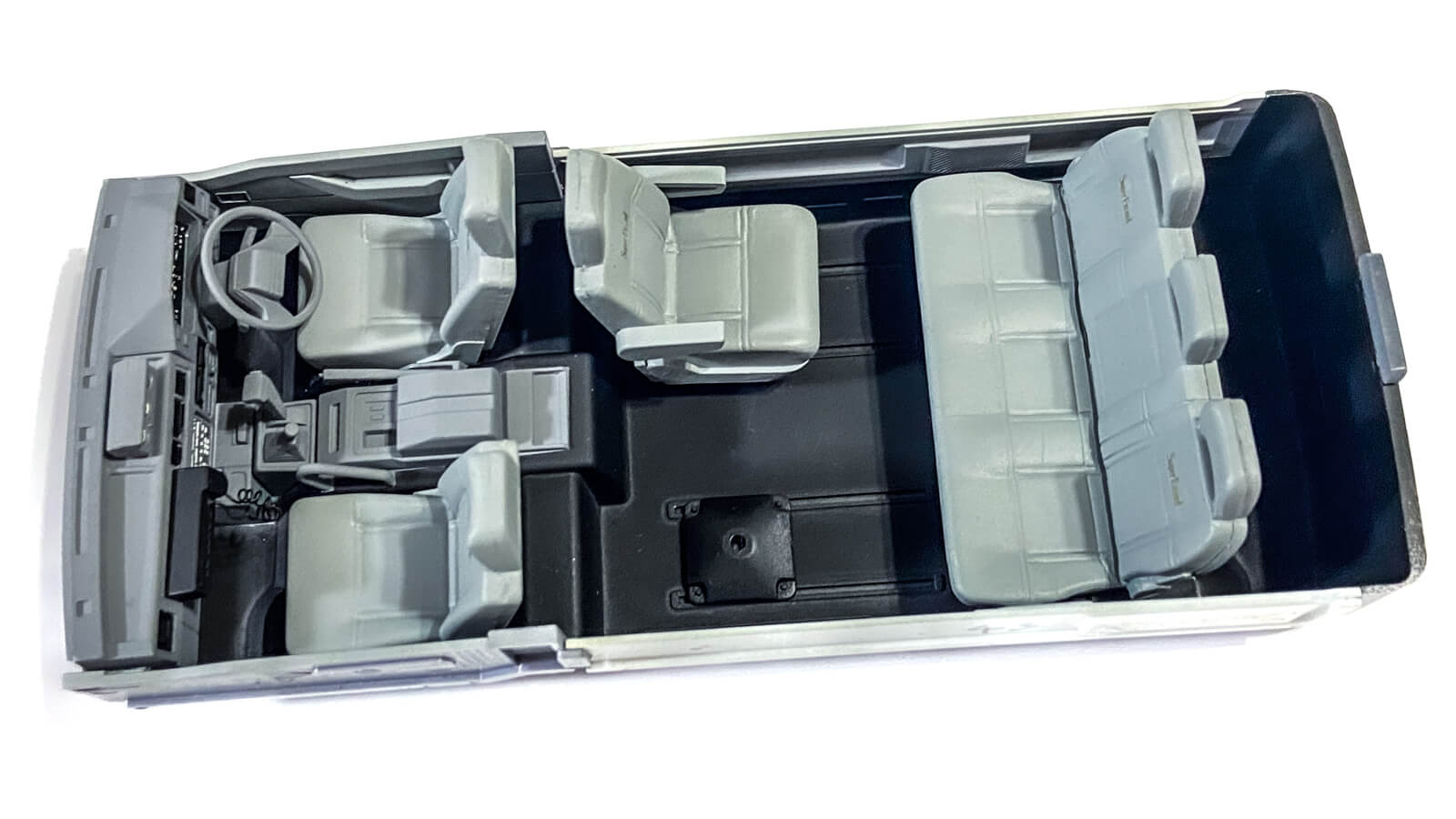 車内は3列シート。2列目の座席が下側に写っている四角い台座を溝の上に置き、その台座の上にシートを置く形になっているので、実車同様に様々な座席配置にすることができます。