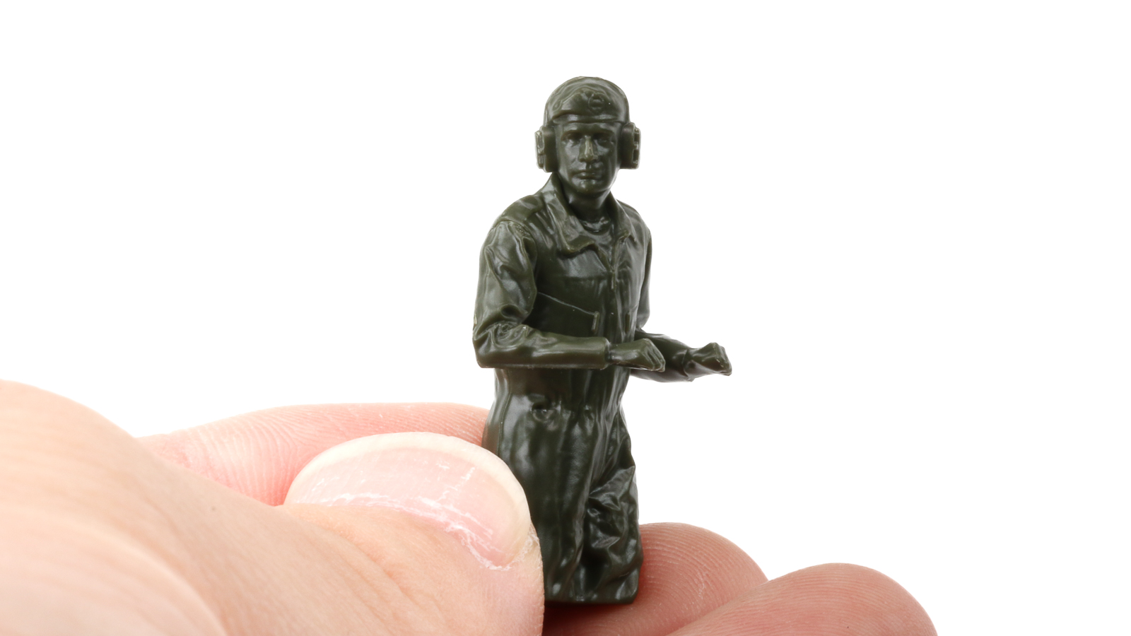 ベレー帽ならツナギの前後、左右の腕、頭を合わせればあっという間に完成します。ちっちゃいけどめっちゃ精緻。実際の人を3Dスキャンして得たデータを元に造形されるタミヤのフィギュアは、本物のようなキレイなシワと、プラモになった時のかっこよさを意識した立体感を両取りした最高のスタイルになっています。