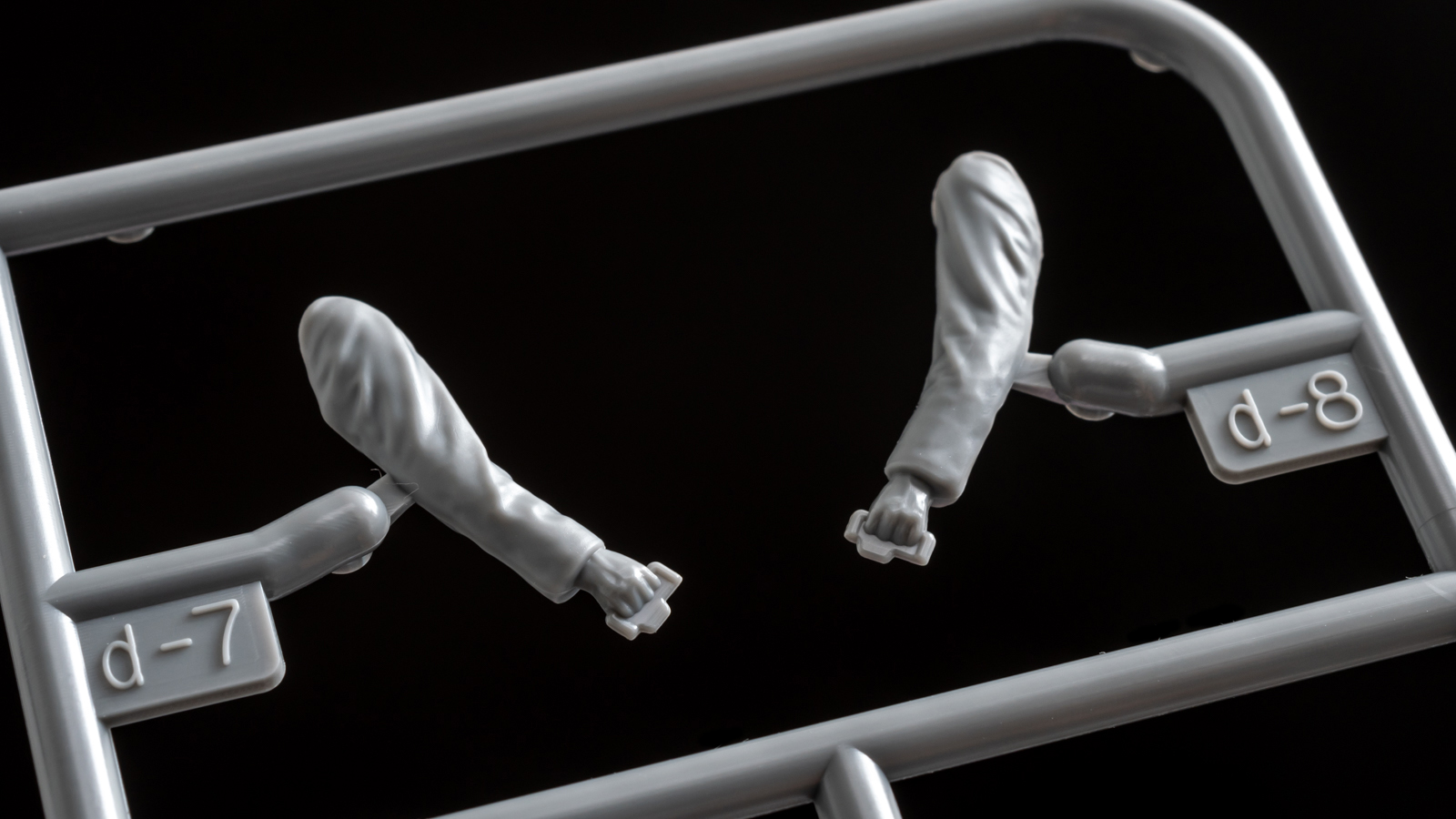 重いものを持ってスピーディーに動こうとすれば(さらに背中にやたらめったらと重量物を背負わされていれば)自ずと体幹は前かがみになる。両腕を重量物に引っ張られ、猫背状態で移動する《兵士1》の服は、前面にギュッとシワが集中し、背中の布は突っ張って滑らかになる。実際に軍服を着た人間を3Dスキャンする設計手法は近年のタミヤではスタンダードになっているが、シワの粗密を模型的な見栄えにマッチさせ、プラスチックパーツに分割するのは設計者の腕の見せ所だ。