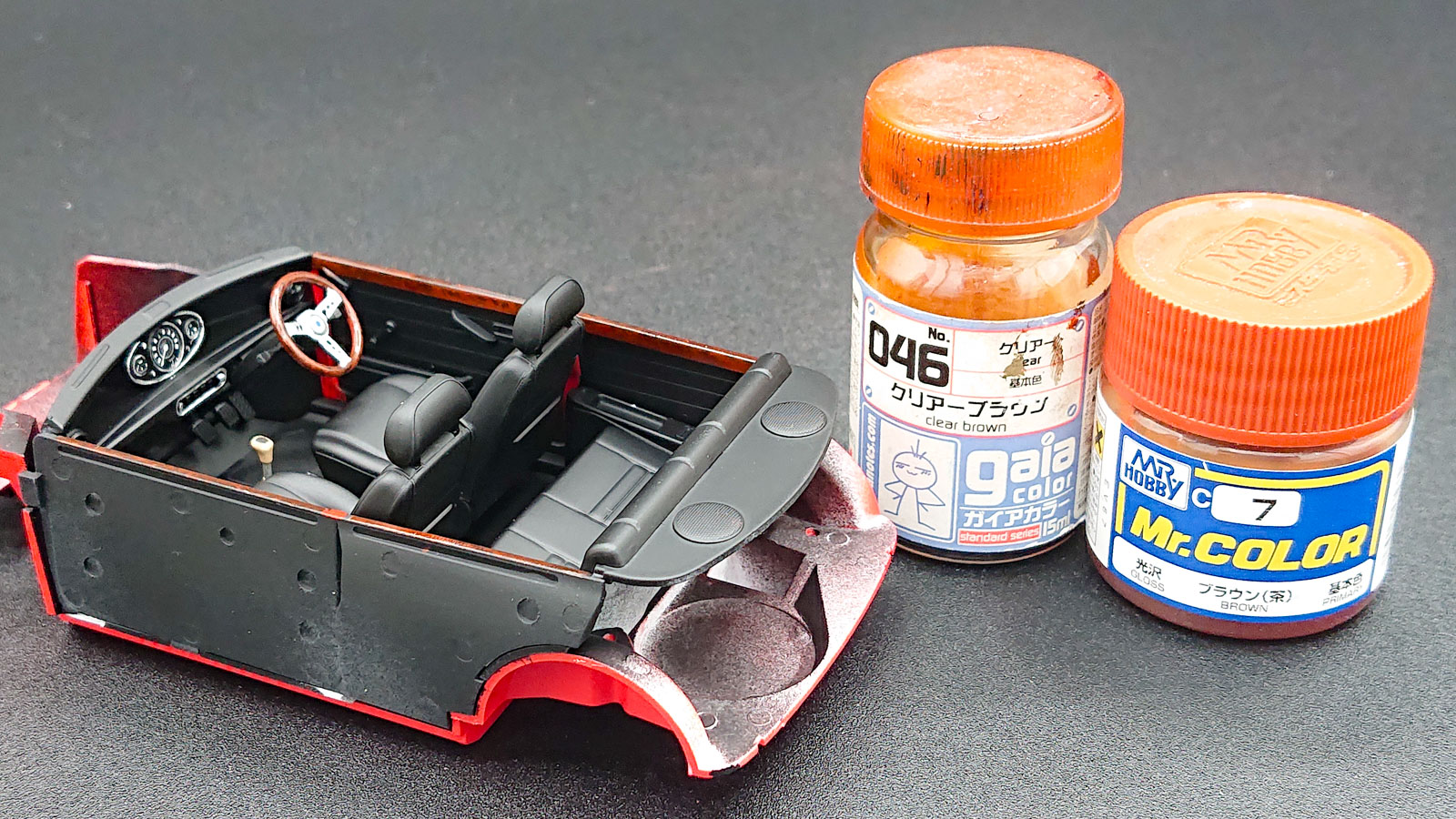 カーモデルの内装ではウッドパネルを塗装するパターンが多々あります。デカールで再現されていることもあるのですが凸凹している内装には意外と貼りづらいことも。そんなときはGSIクレオスの発色抜群なブラウンとガイアノーツのクリアーブラウンを組み合わせてウッドパネルを再現しましょう。今回紹介する塗料は乾燥も早いので、手早くウッドパネルを入手可能です。