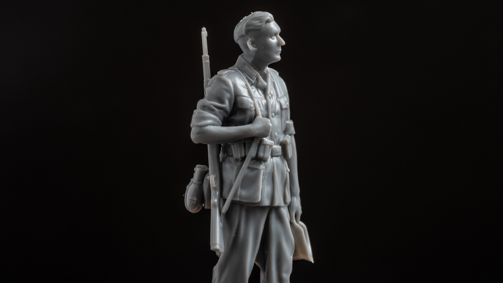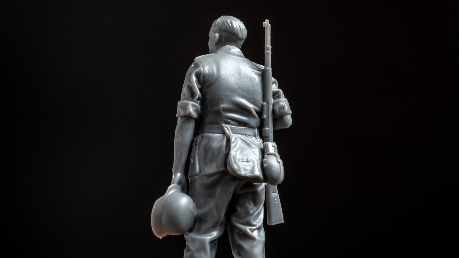 板状の出っ張りの正体はライフルを肩にかけるためのスリングだ。胴体に彫刻された右肩のスリングと、腰から下の別パーツに彫刻されたまっすぐに伸びるスリング。両者の間にはちょうど右手のパーツが来るようになっていて、あたかもスリングがひと続きになっているように感じられる、という寸法だ。