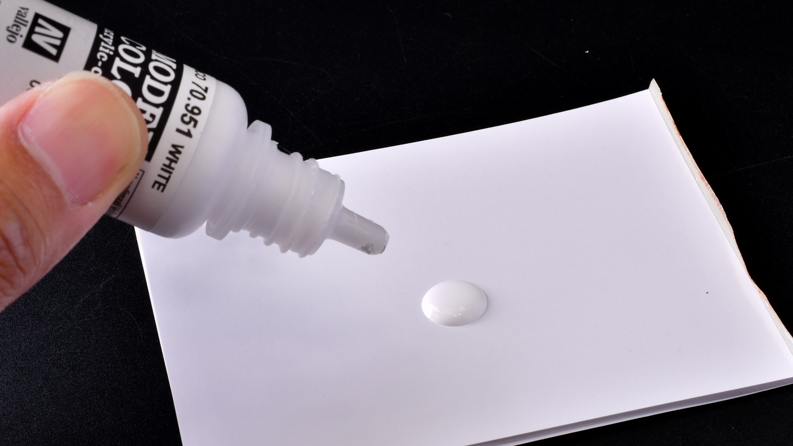 ファレホの「ホワイト」は、とってもニュートラルの白でクセがありません。そして水性塗料の城の中でも隠蔽力が高い方なので、2回くらい塗ると白がしっかりと発色してくれます。色の良さと発色の良さで、使い心地が抜群なのであります!! 早速少量の水で希釈して伸びをよくしてから、パーツに塗ってみましょう。