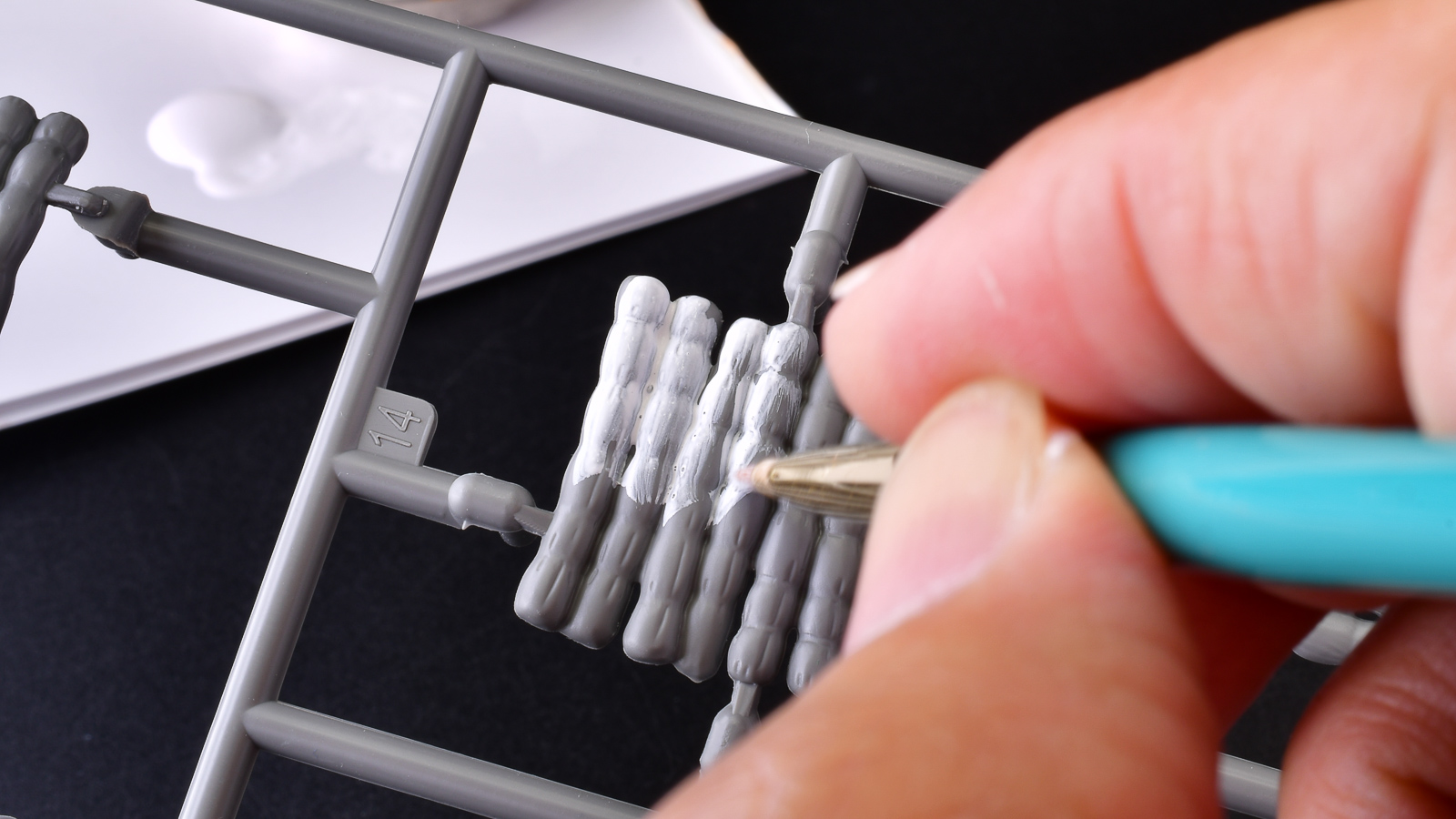 グレーの成型色(プラスチックの色のこと)にそのまま塗ります。1度塗りでは下のグレーが少し透けますが、白と認識できるほど発色し、しかも弾かれないで定着しています。