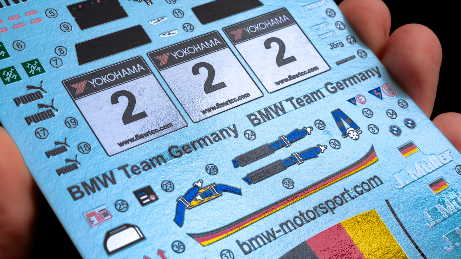白いボディは透けもなくきれいなプラスチックなので、そのままデカールを貼り始めたよの図。とっても地味な320iも、ドイツ国旗の3色を纏うと一気にレーシーな気分が盛り上がります。しかし土手っ腹に入っているベタベタの書体で書かれたURL、正直言ってダサい!しかしこのダサさがこのマシンの魅力でもあるんだわ。
