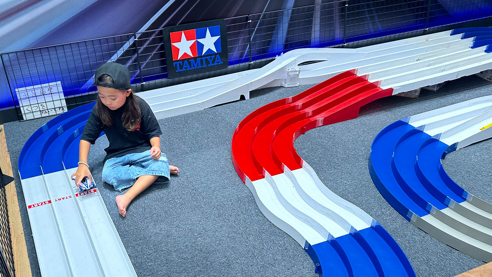 スタート位置に置いて……この緊張感……たまりません。息子がミニ四駆から手を離します!! スタート!!! しかしこれもお約束「1周目でコースアウト!」。華麗に吹っ飛んでいったマシンの姿が当時の記憶を思い出させてくれます。
