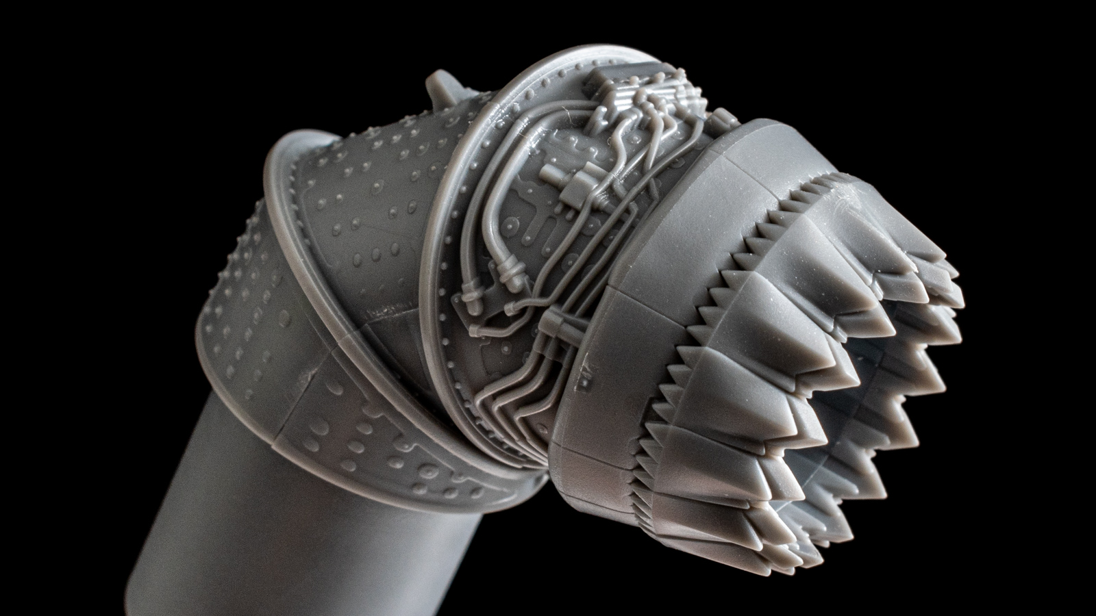 エンジンを組んでいてびっくりしたのが排気ダクトの表面に張り付いた細い配管。ノズルと一体成型になっているのに彫刻が深く、さらにパーツはスパッと直線的に分割されているのに接着したら配管がどこで分割されていたのかさっぱりわからないほど高精度な合わせを実現しています。ノズル先端部のギザギザも素晴らしい立体感!