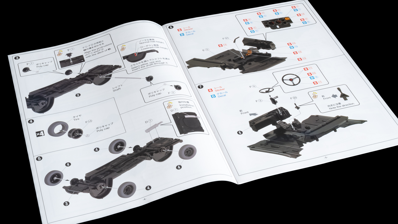 1/32の楽プラと異なるところは、シャーシ裏側が立体的に彫刻されていること、前輪がステアリングするところ、そして細かなマーキングにシールだけでなく水転写デカールも用意していること。それ以外は「ニッパーでパーツを切って所定のところにハメる」という所作だけでピシッとした見た目のカーモデルが完成する……という内容です。正確さ、精密さを追い求める1/24スケールのカーモデルシーンにおいて、こんなふうにステップバックしたイージーなモデルを生み出す勇気はいくら称賛しても足りないほどだと思います。