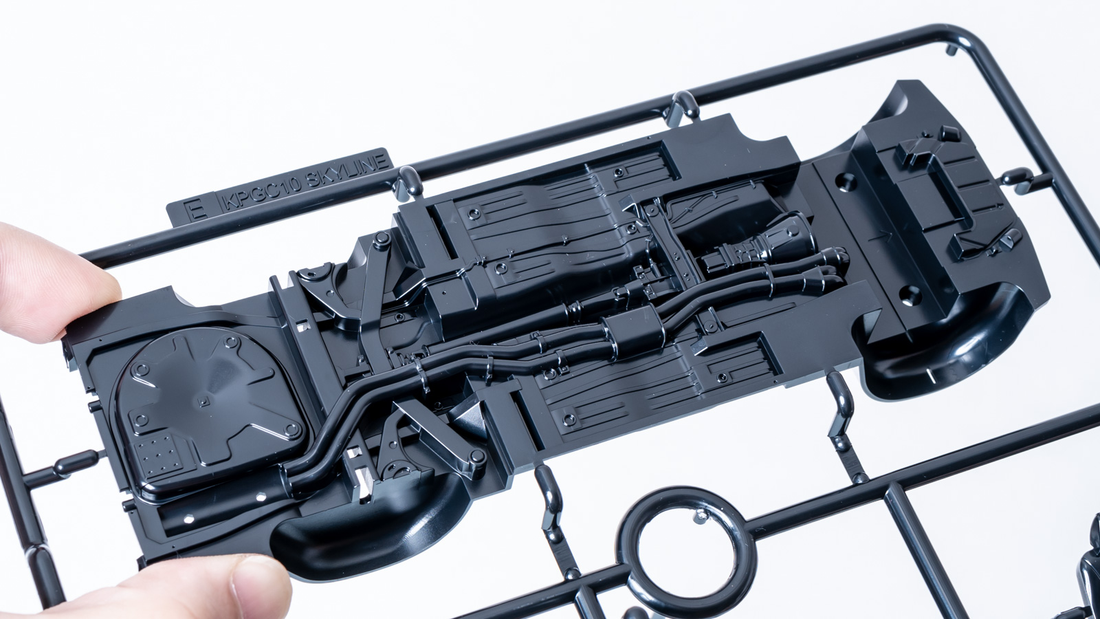 第一弾となったKPGC10 スカイラインHT 2000GT-Rはいまから55年前のクルマですから、それ以下の年齢の人たちにとっては「生まれる前の自動車」……ということで、このチョイスは時代を超えたハコスカ人気(そしておそらくはアオシマに蓄積されてきたであろう膨大な販売データ!)を反映したものなのでしょう。いざ組み始めてみると、その感触は1/32の楽プラが1.5倍の大きさになったパーツを組み合わせていくという安心感に満ちあふれています。