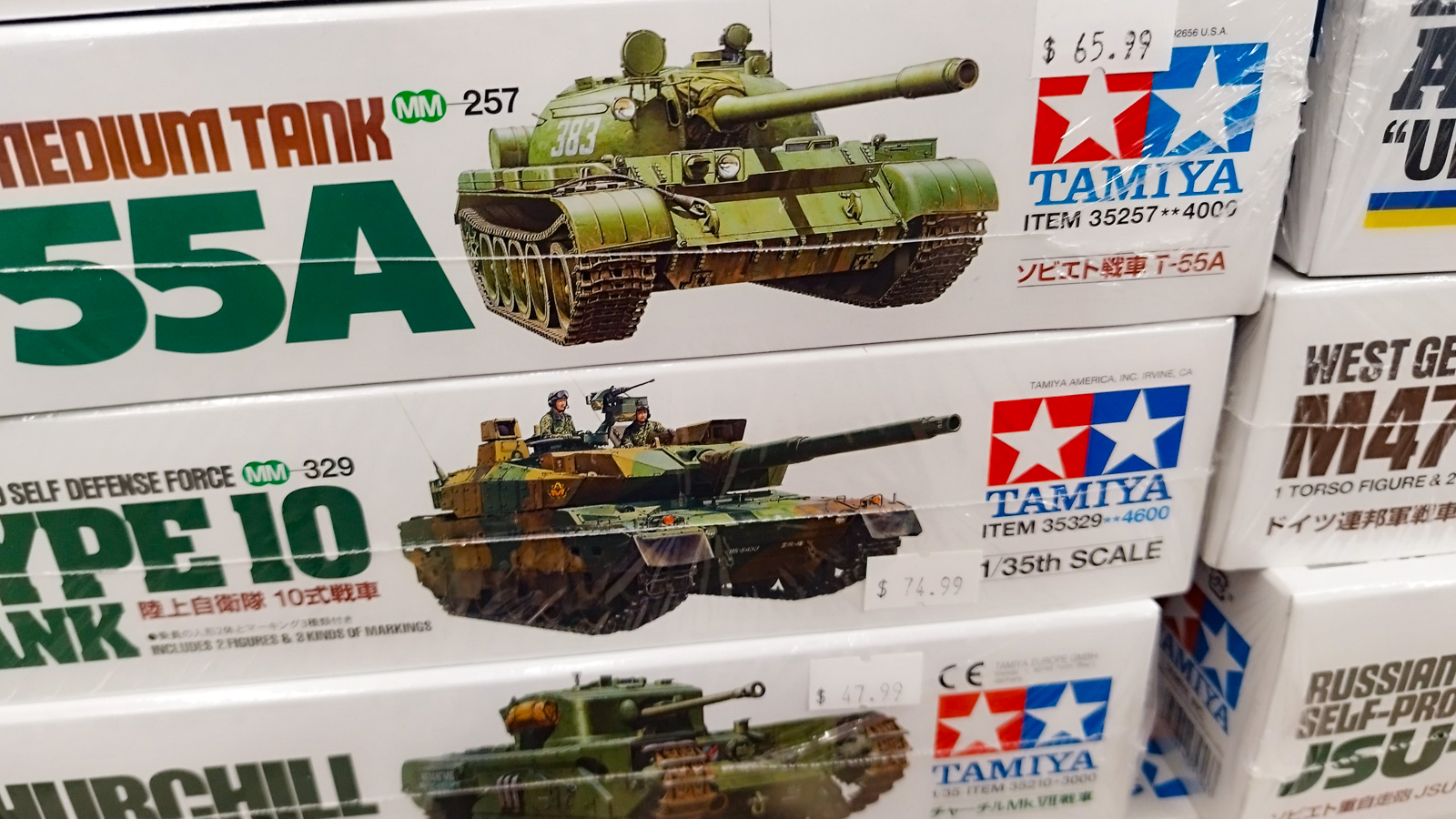 何を買おうか迷いながらプラモデルの箱を手に取る。そして何気なく値段を見て唖然、タミヤの1/35のT-55Aが65カナダドルだった。日本円にして大体7000円前後。タミヤでこの価格は覚悟のいる価格だ。後に判明したことだが、カナダでは日本のプラモデルは4~5割増しの価格が一般的だという。塗料もMr.colorがひとつ3.5ドル。国産メーカーが多いことによるメリットをこんなところで感じてしまった。さすがに価格は国境を超えると変わる。私は覚悟と薬を決めることにした。