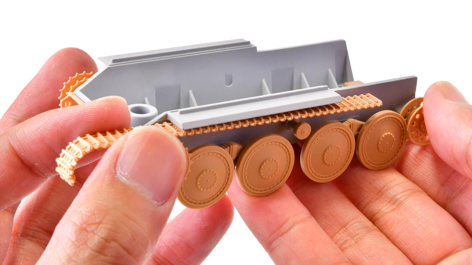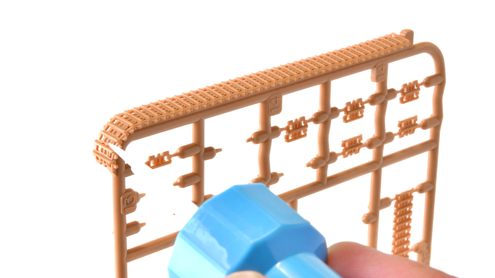 戦車のアイデンティティである履帯(俗に言うキャタピラ)は、一部が繋がった状態で成型された部分連結式。前後のカーブ部分のみ、1枚〜2枚で成型されたパーツを接着していきます。その接着をサポートしてくれるのが、ランナーの外側に成型された治具です。ここに履帯のパーツを置いて、綺麗なカーブを作ります。