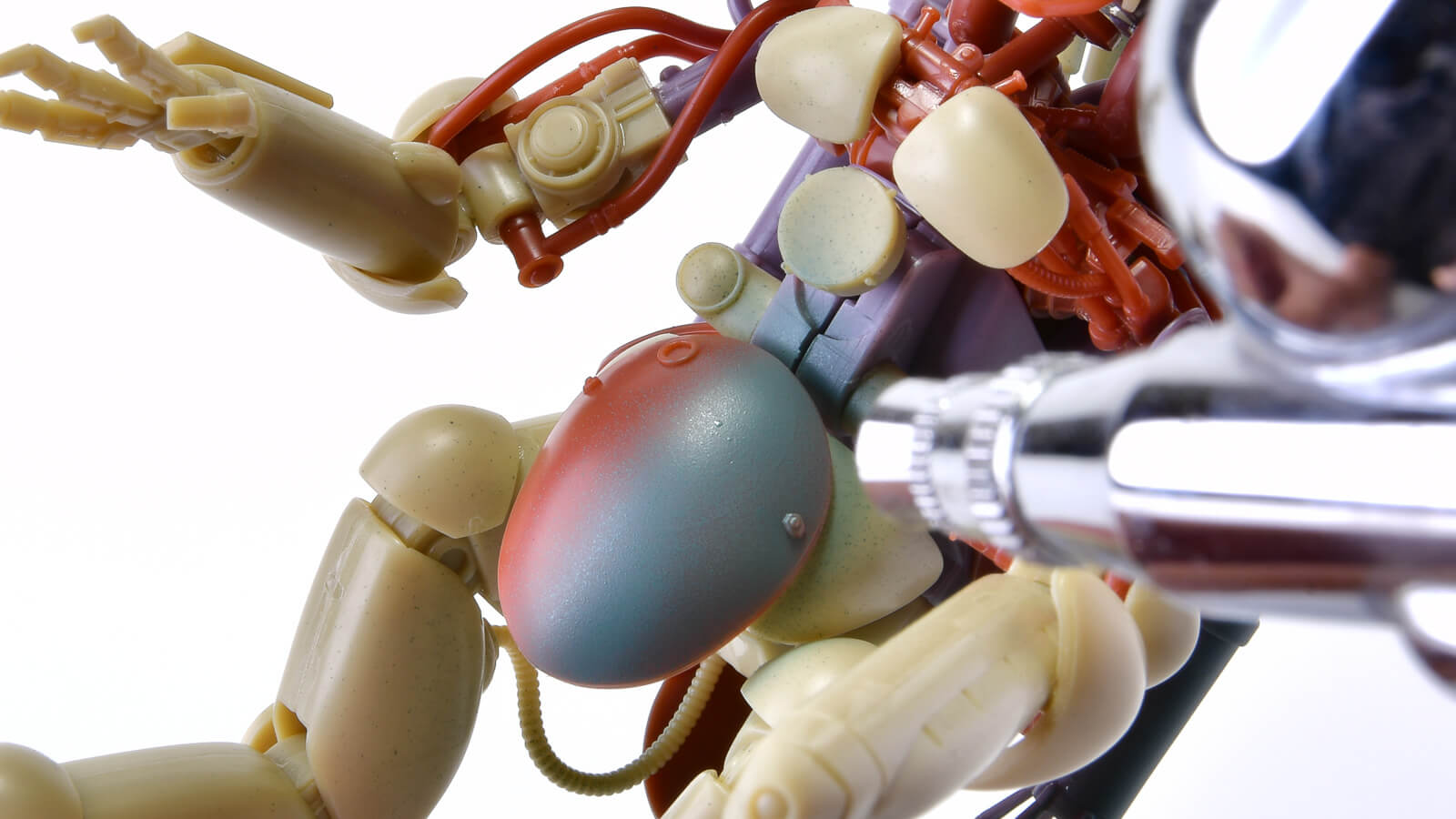 濃いグレーの成型色が、青緑のATブルーグレーの良い下地色となってくれます。関節・フレームグレーを筆塗りで楽しむ時に、ぜひこのATブルーグレーでグレーの色情報を豊かにしてみてください。