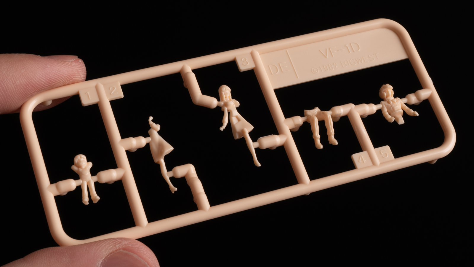 楽しいフィギュアは着座状態の一条輝、左右の腕と脚がそれぞれ前後に分割されたワンピースといっしょに造形された分割が楽しいリン・ミンメイ、そしてワンパーツでこれ以上ないポーズを取ったヨッちゃんの3人が付属。1/72スケールなので指先サイズなのですが、それでもよく見るとちゃんと「芝居」をしているのがわかります。