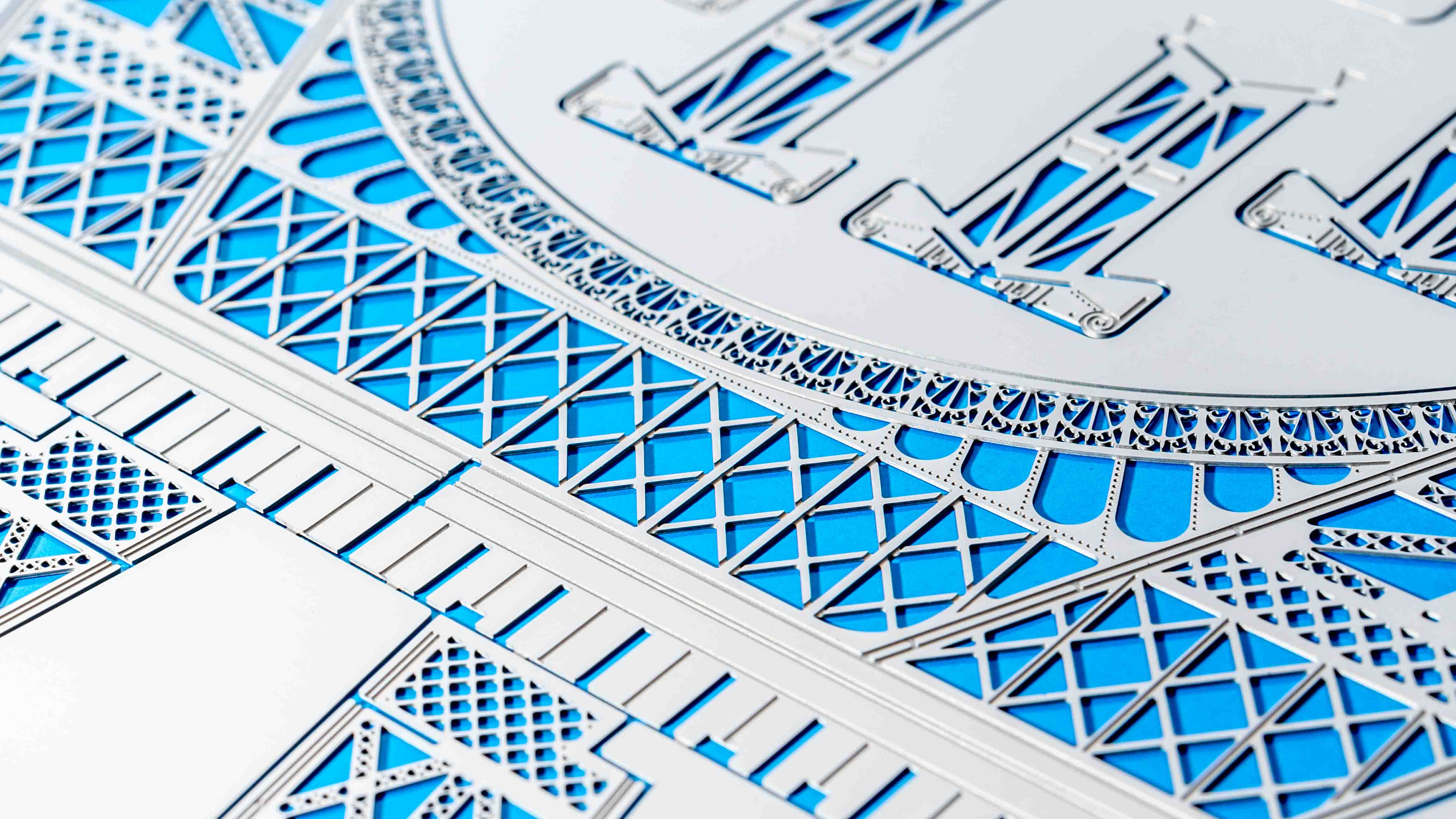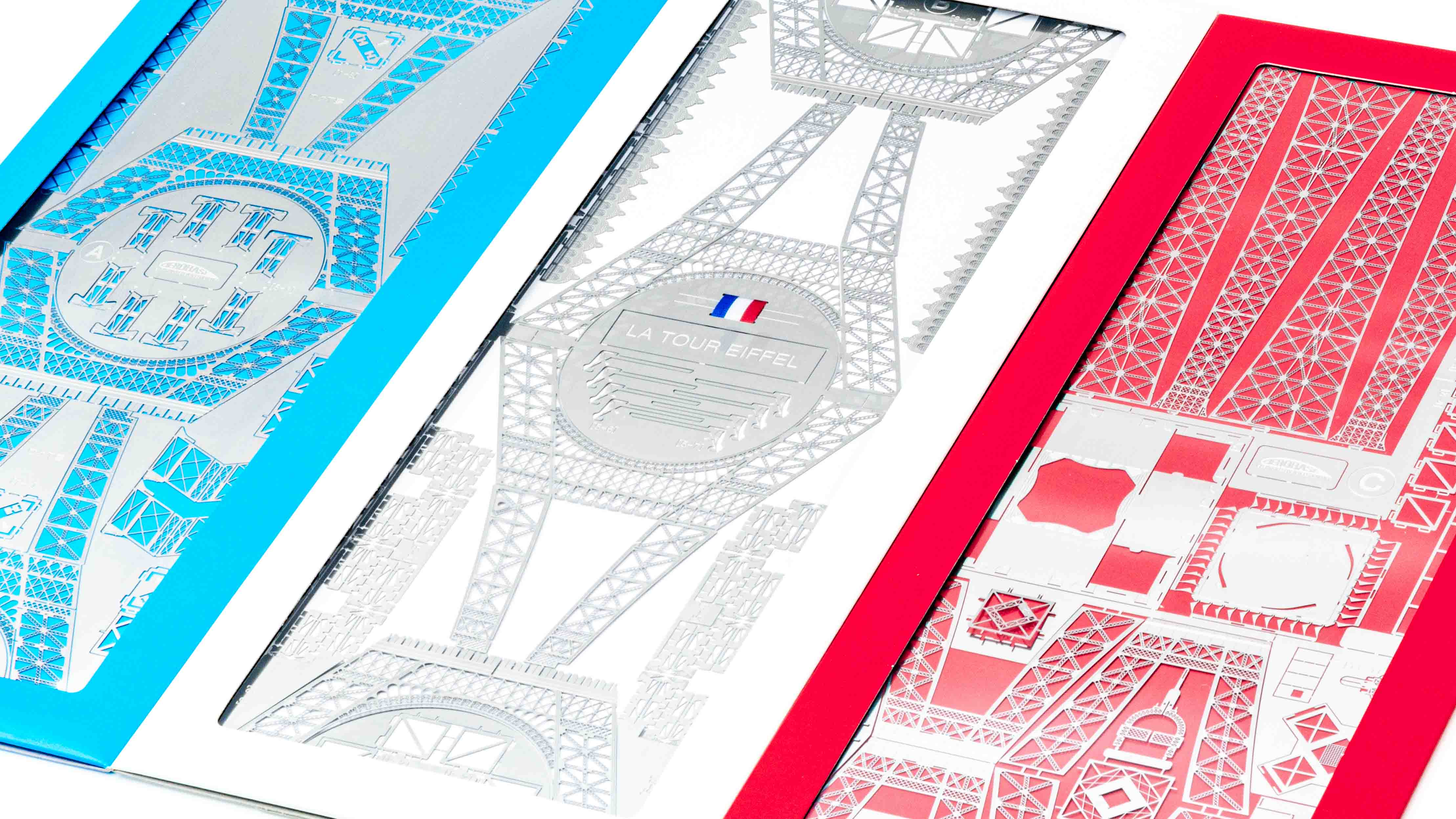 3色の台紙に3枚の金属板。そのモチーフは言うまでもありませんが、「キットを開梱する瞬間の高揚感」をここまで美しくデザインするなんて、本当にステキです。クローズアップで撮影すると、厚さ0.2mmの金属板の厚みに対して、どれほどこまかな彫刻が入っているかがわかります。こんなに繊細なパーツをどうやって切り離し、組み上げていくのか……と心配になります。